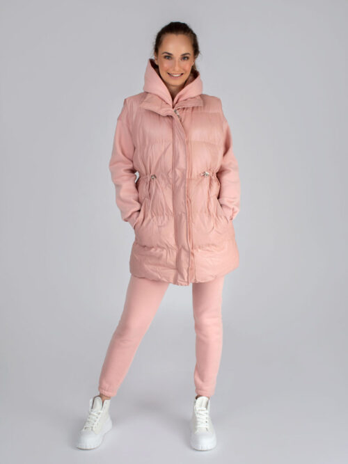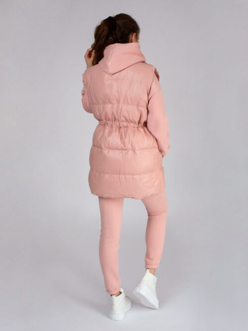 Dámska vesta bez rukávov v ružovej farbe. Vesta je vyrobená z kvalitného materiálu, ktorý má mierne kožený vzhľad. Je prešívaná, vpredu sa zapína na zips po celej dĺžke a po boku má vrecká. V páse sa sťahuje na šnúrku, čím si ju vieš prispôsobiť na svoju postavu a zvýrazniť tak pás. Trendový kúsok, ktorý je v súčasnosti veľmi populárny v kombinácii s teplákovou súpravou. Vhodná na voľný čas, ale aj na bežné nosenie.