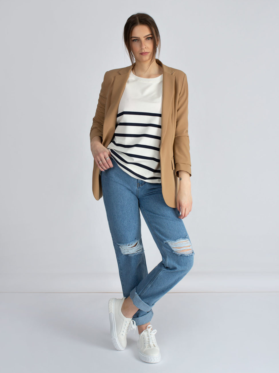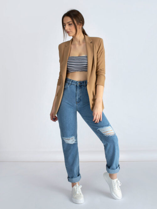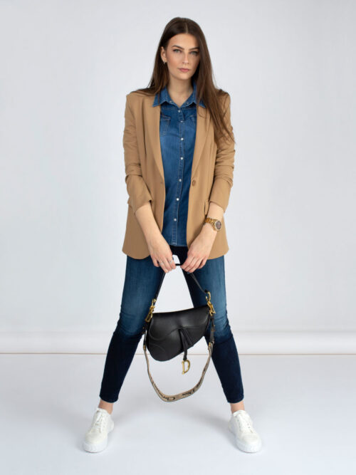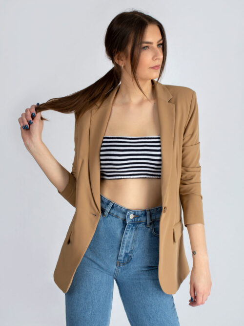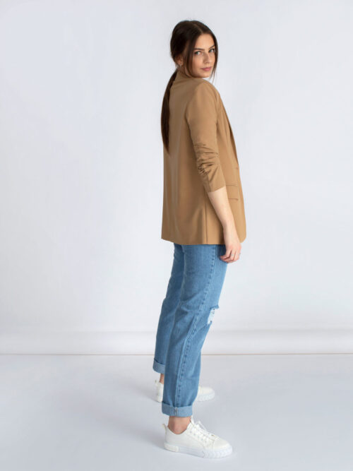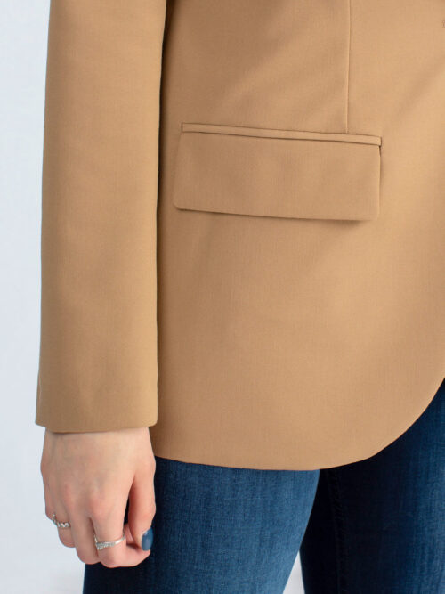 Kvalitné dámske sako rovného strihu v béžovej farbe z dielne talianskej značky IMPERIAL. Sako má dlhé rukávy a dĺžka saka siaha po zadok. V prednej časti po stranách sa nachádzajú vrecká. Sako je bez podšívky.