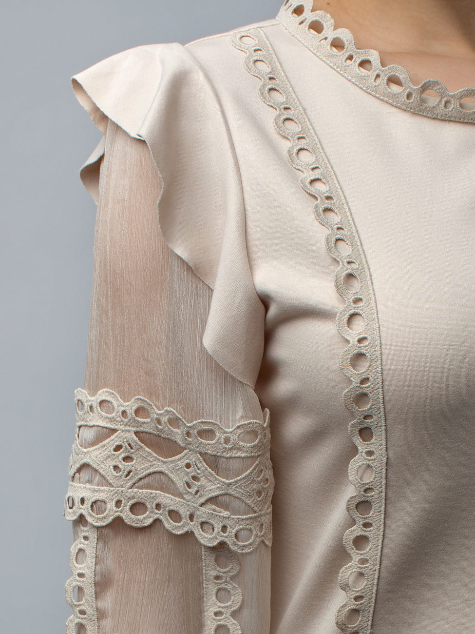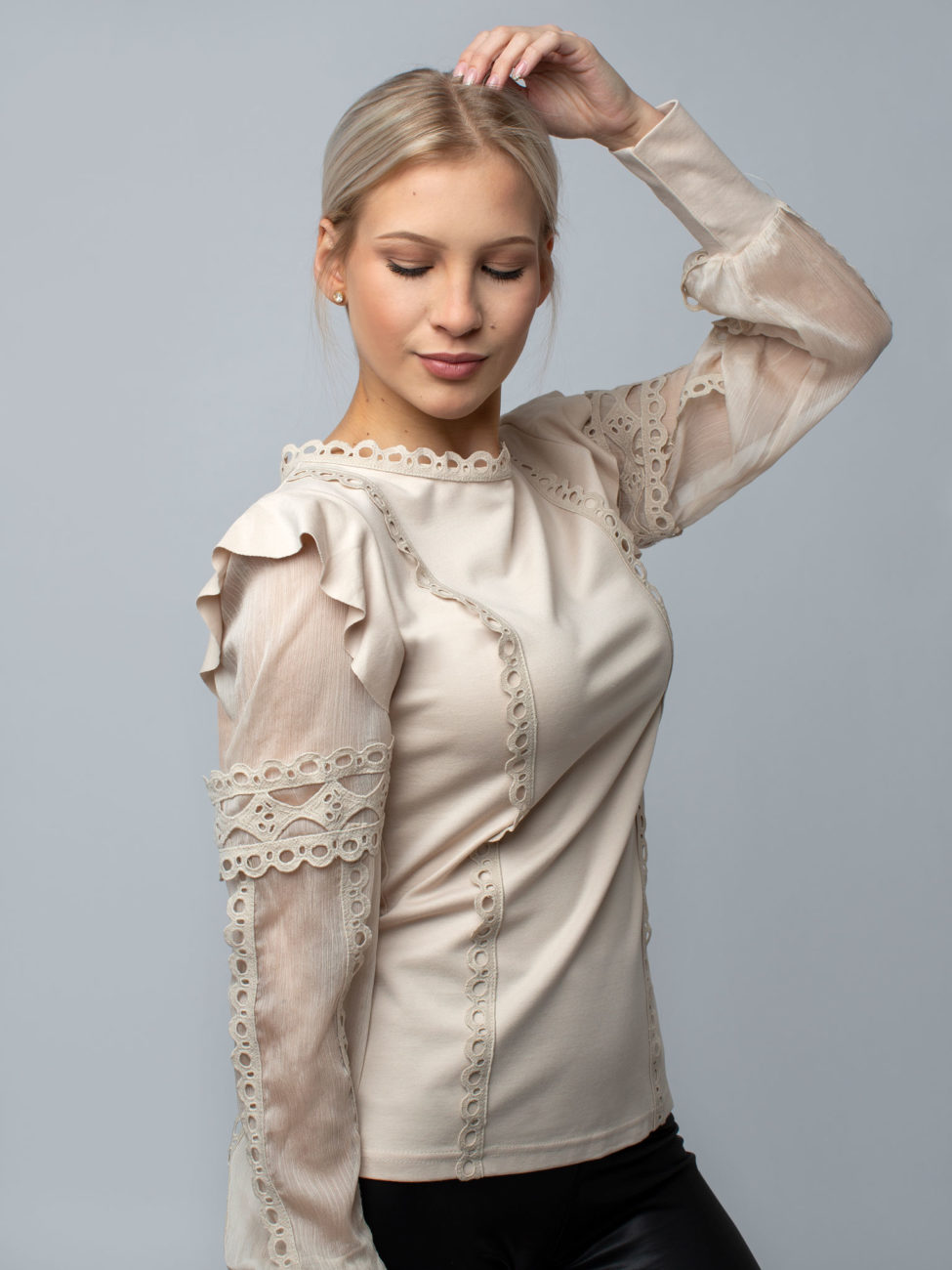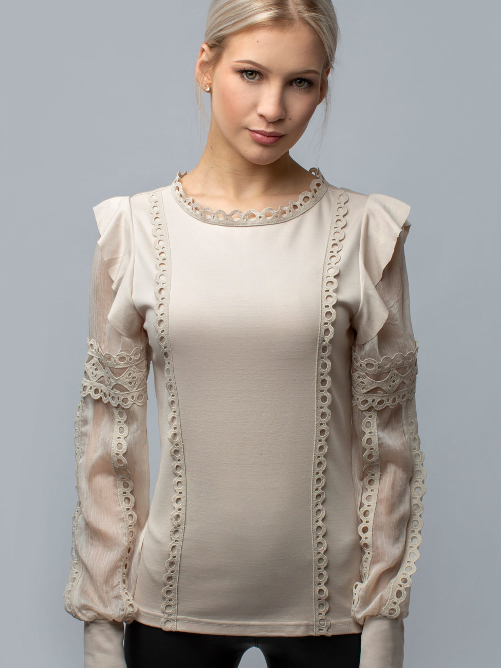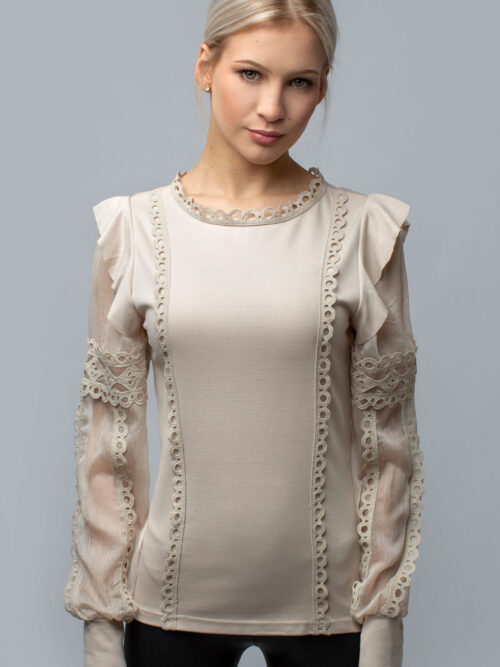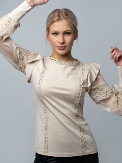 Elegantný dámsky top z tričkoviny v béžovej farbe. Top je vyrobený z kvalitného materiálu a budeš sa v ňom cítiť pohodlne celý deň. Rukávy sú priesvitné, zdobené krásnou krajkou, ktorá sa nachádza taktiež na prednom diele a okolo krku. Zaujímavý kúsok, ktorý sa dokonale hodí na mnoho príležitostí. Je len na Tvojej fantázii, s čím ho skombinuješ.