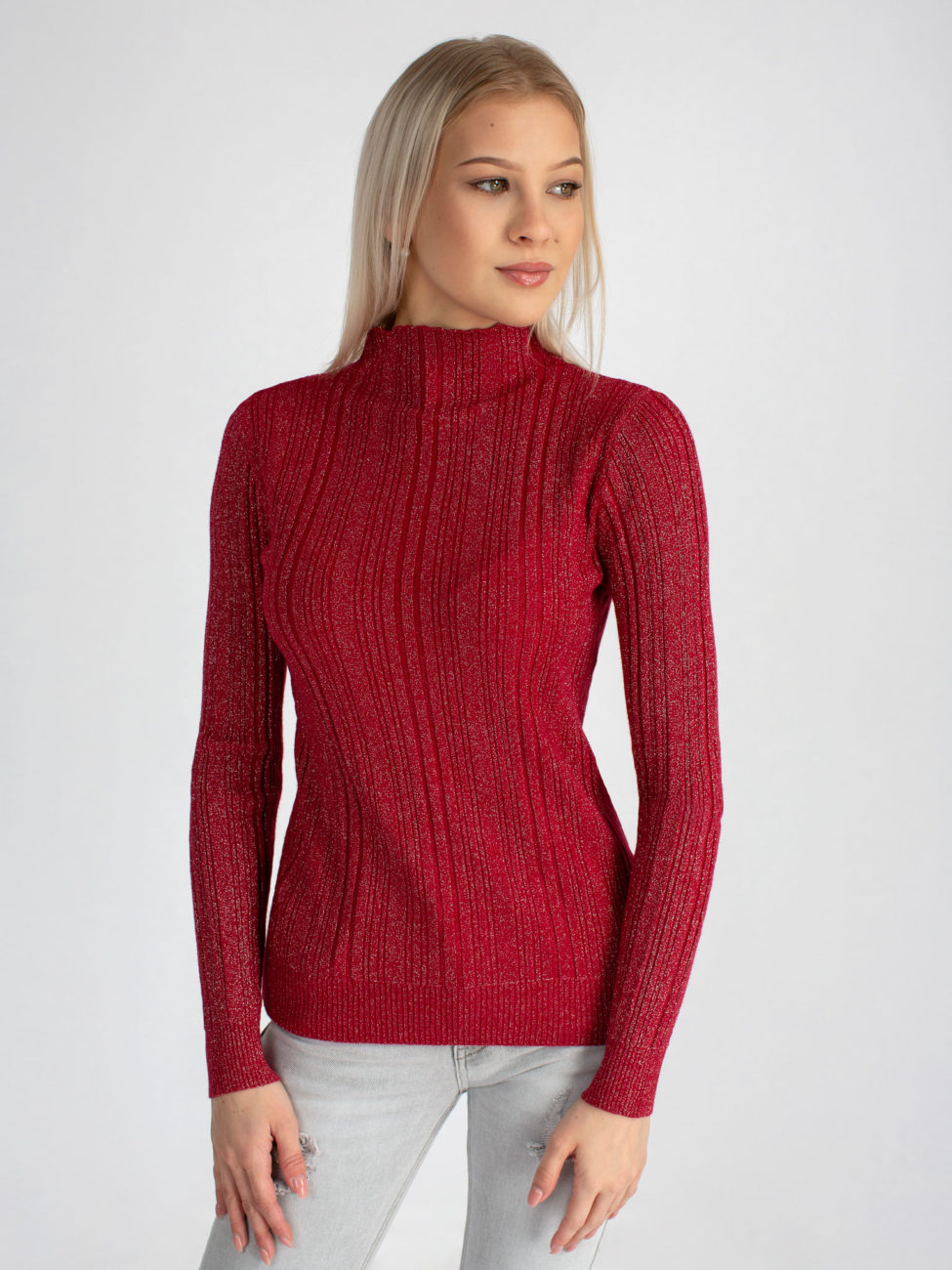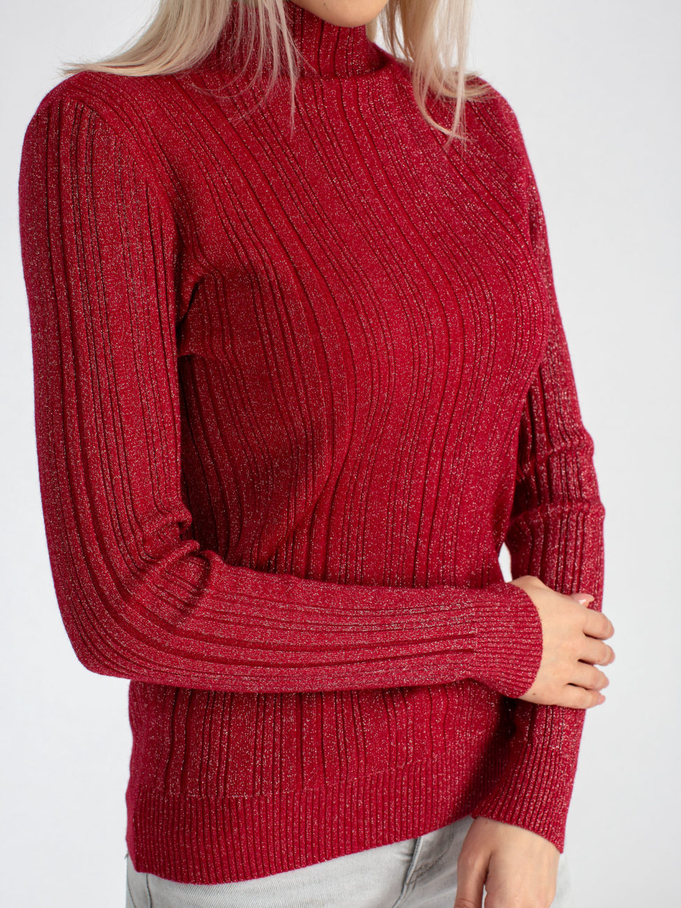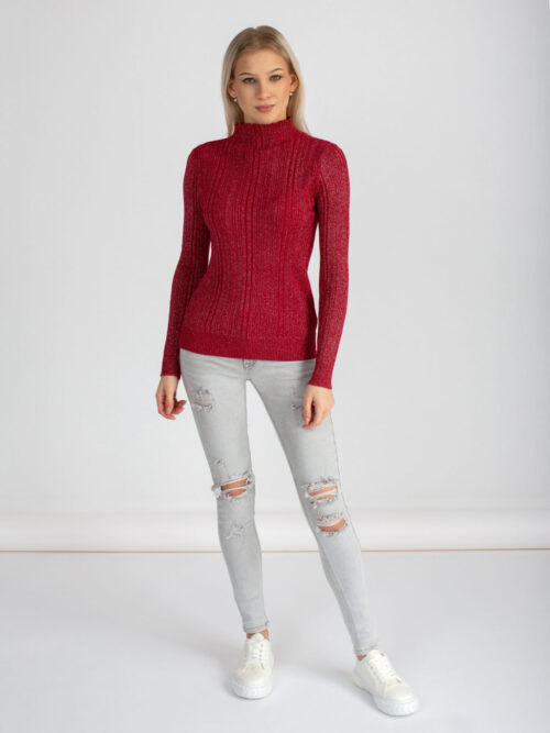 Dámsky tenší svetrík v tmavo červenej farbe. Svetrík je priliehavý, vyrobený z vrúbkovaného elastického úpletu s kašmírom. Má dlhý rukáv a polorolák. Pohodlný kúsok, v ktorom určite zažiariš!
