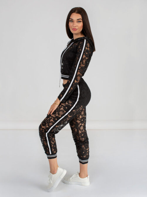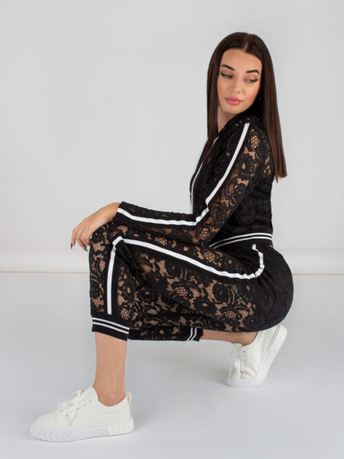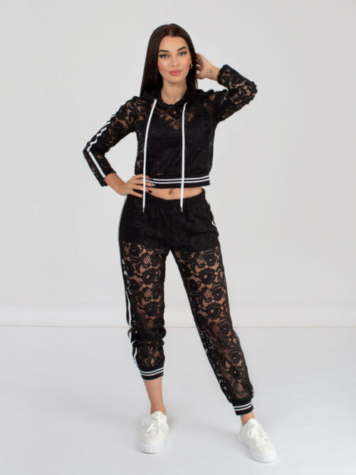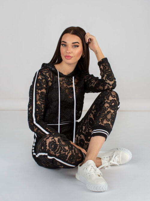 Dámska čipkovaná crop top mikina v čiernej farbe z dielne talianskej značky RINASCIMENTO. Mikina je vyrobená z vysoko kvalitnej čipky a v zadnej časti má kapucňu. Rafinovaný kúsok, ktorý nesmie chýbať v tvojom šatníku!
