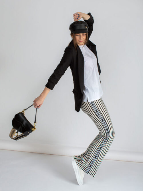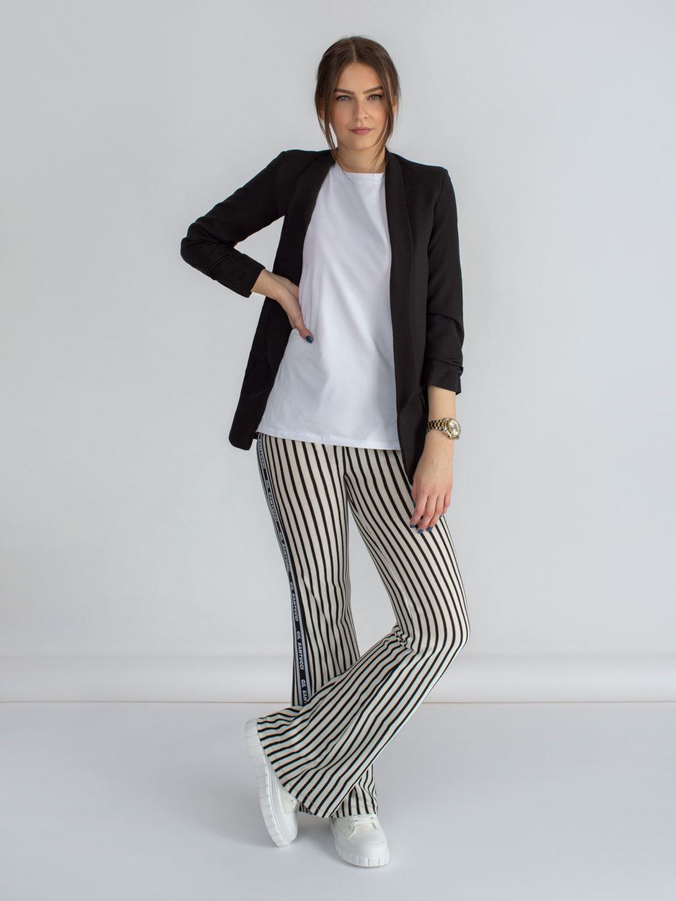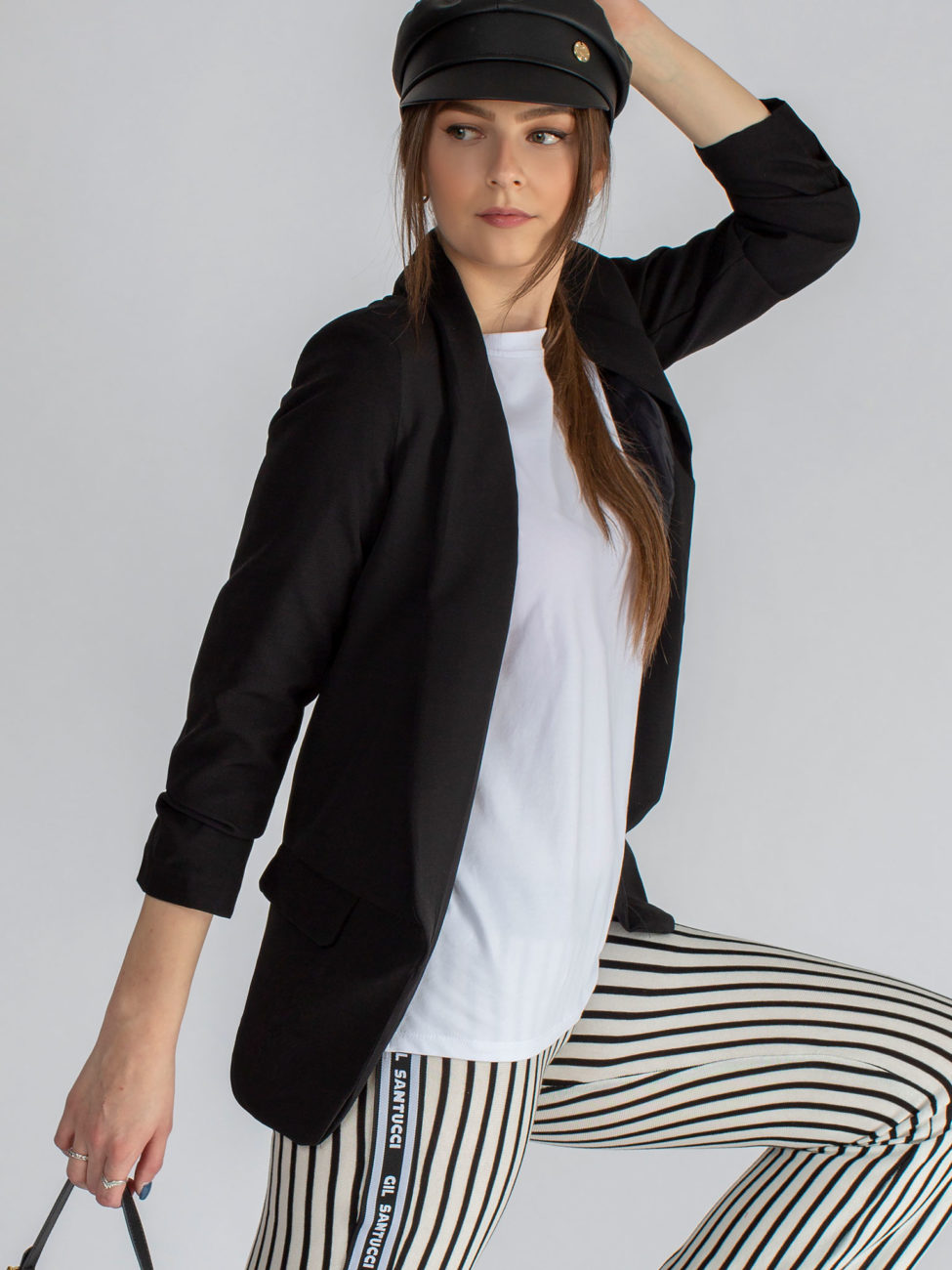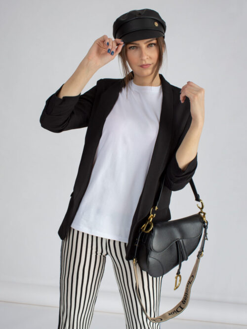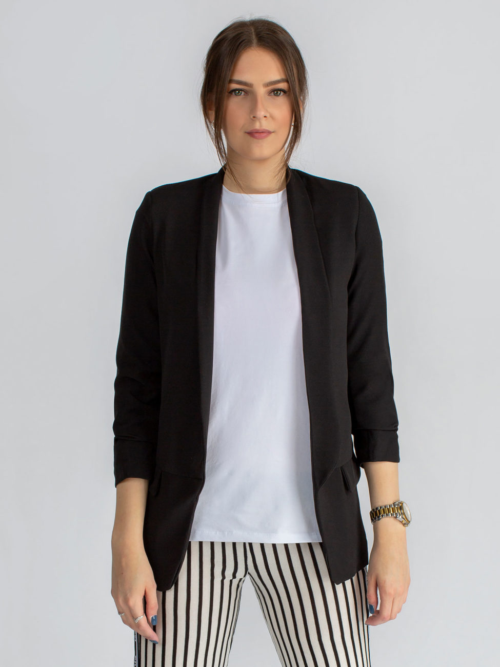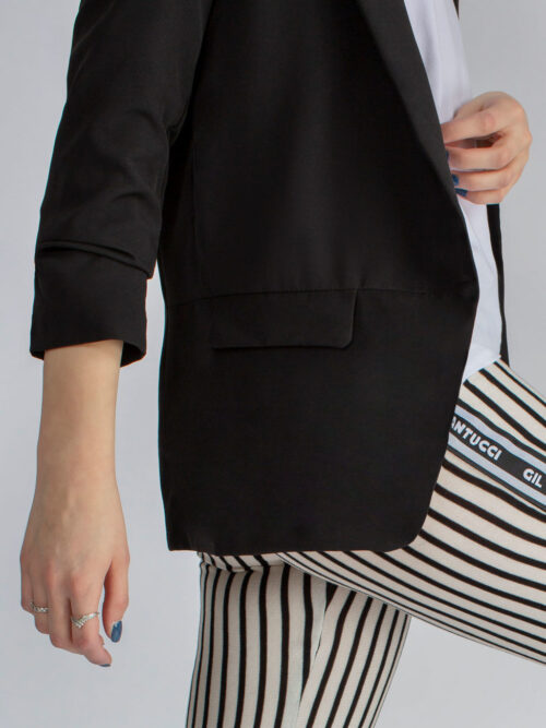 Klasické dámske sako rovného strihu v čiernej farbe. Sako má 3/4 rukávy, ktoré sú v spodnej časti nazbierané. Dĺžka saka siaha po zadok. V prednej časti po stranách sa nachádzajú falošné vrecká. Sako je podšité podšívkou.
