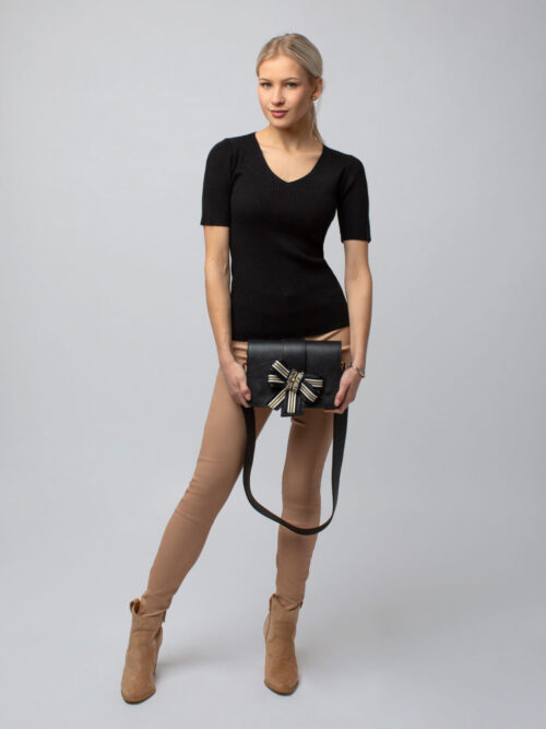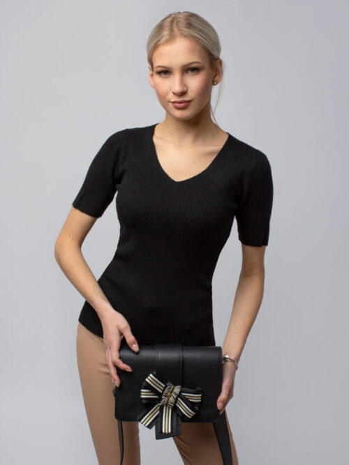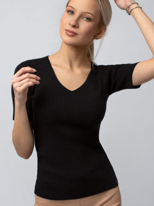 Dámsky top z príjemného vrúbkovaného materiálu v čiernej farbe. Top má krátky rukáv a V-čkový výstrih. Pohodlný kúsok, ktorý si určite zamiluješ.