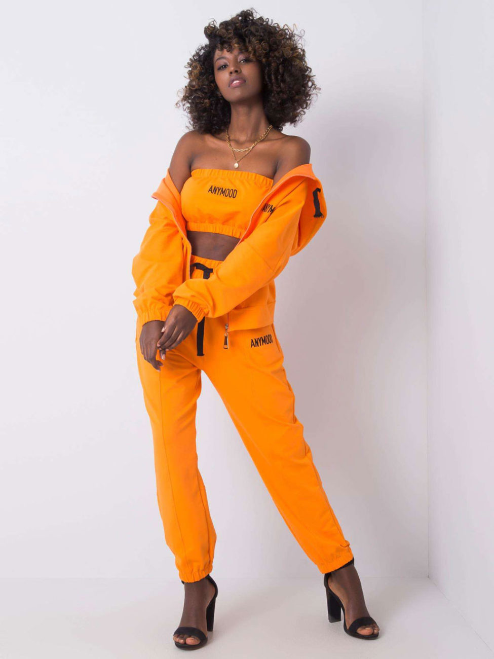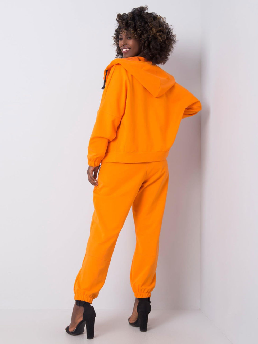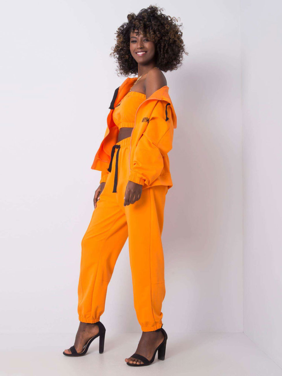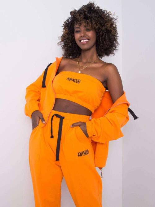 Pohodlná tepláková súprava v oranžovej farbe. Súprava sa skladá z mikiny na zips, crop topu a teplákov. V tomto kúsku určite nesplyniete s davom. Súprava je veľmi pohodlná a vhodná na bežné nosenie.