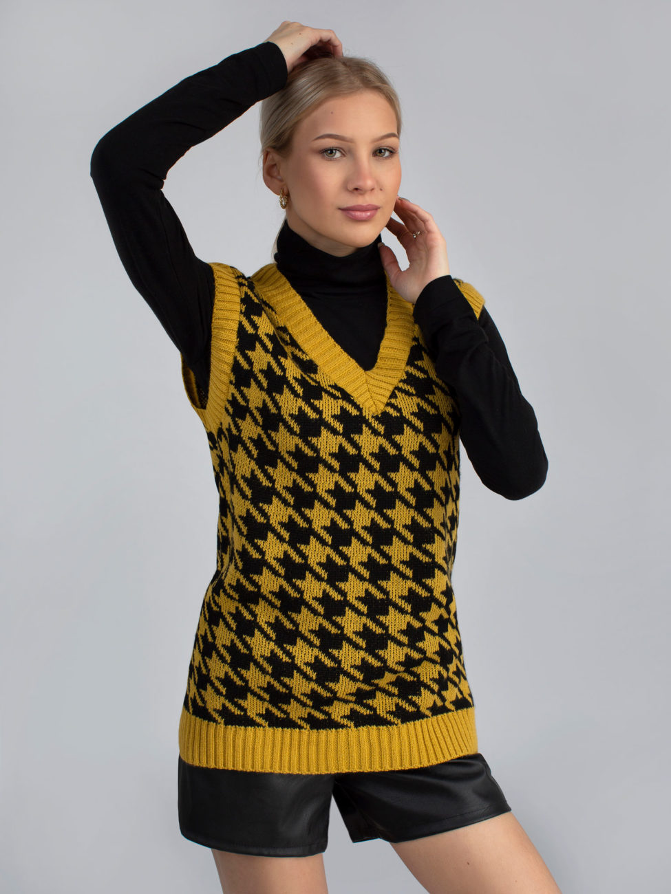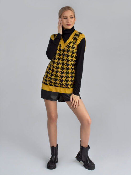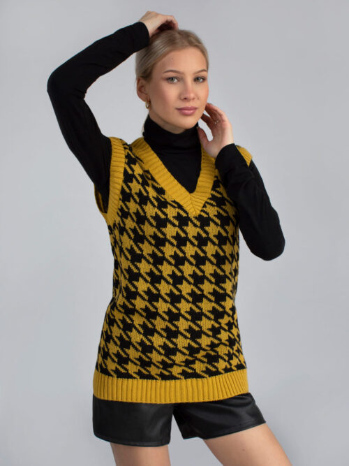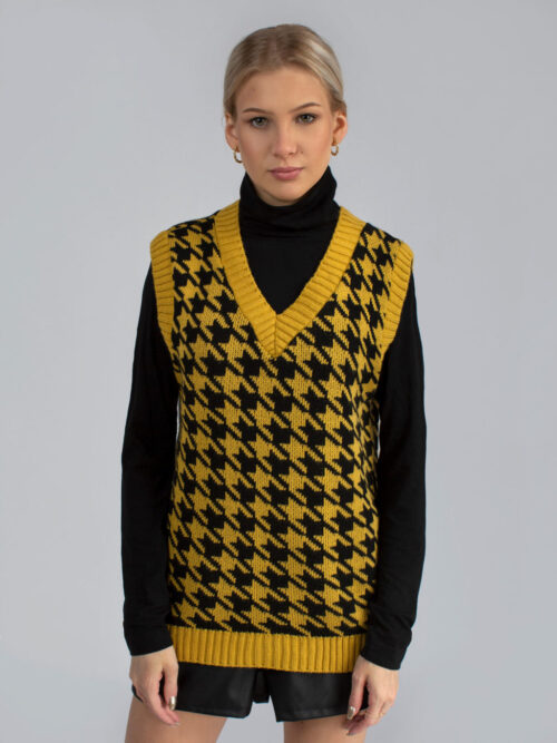 Trendy dámska pletená vesta s véčkovým výstrihom. Vesta je vyrobená z príjemného materiálu a má nesmrteľný vzor – kohútia stopa. Môžeš ju nosiť na košeľu, rolák alebo len samotnú vestu. Tento kúsok rozhodne nesmie chýbať v skrini každej srpávnej fashionistke.