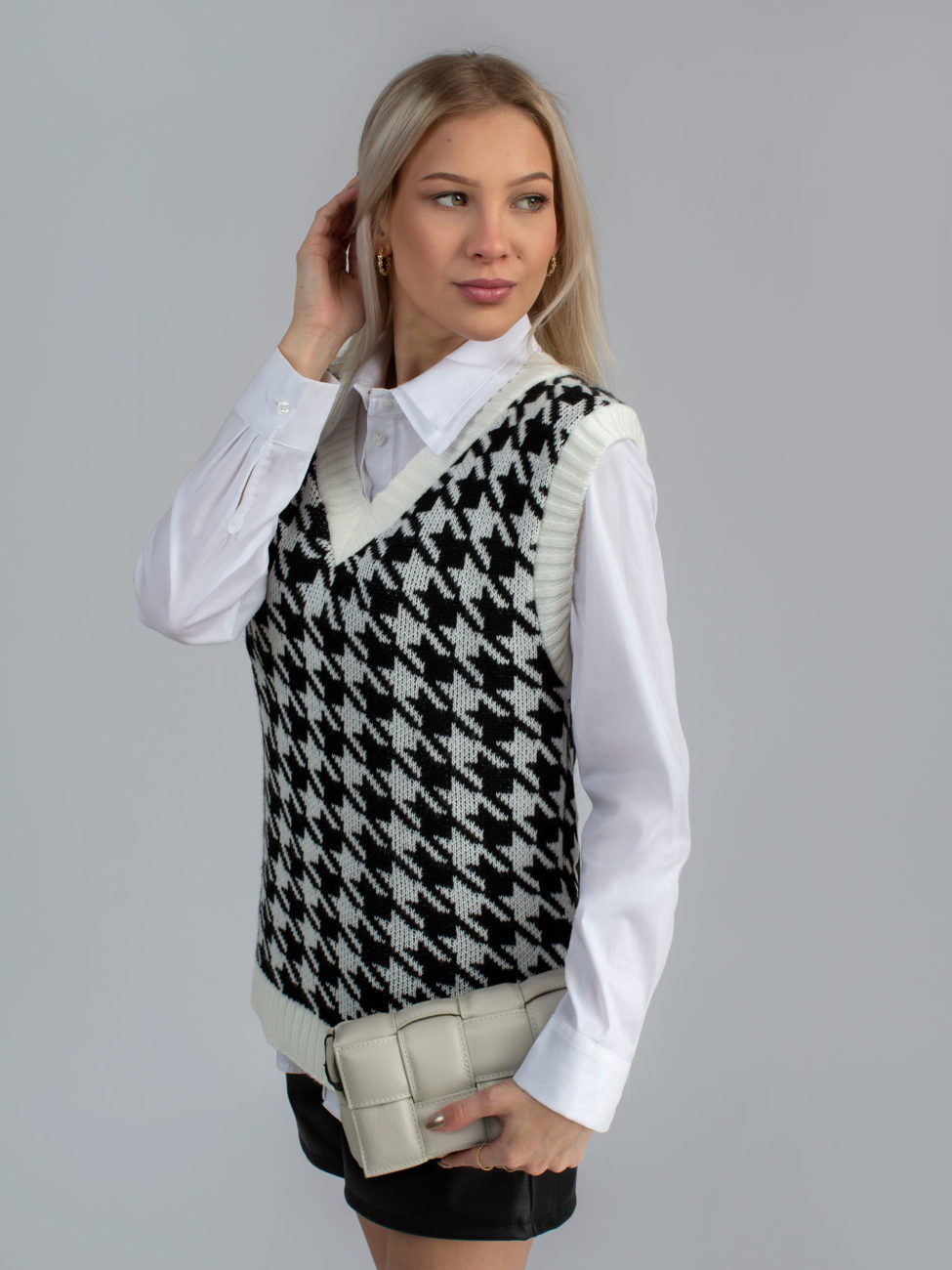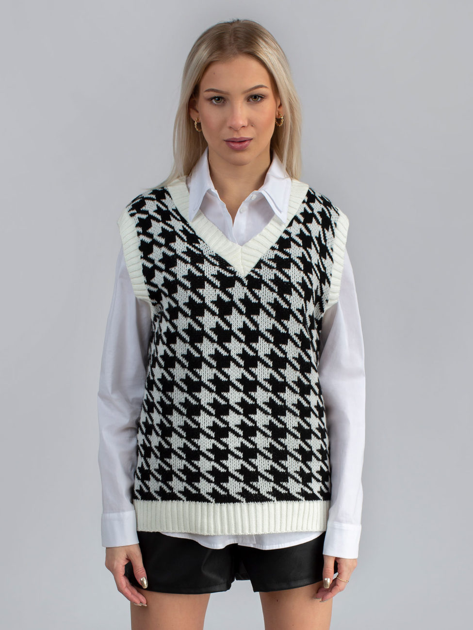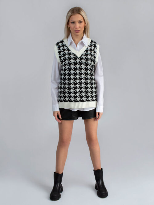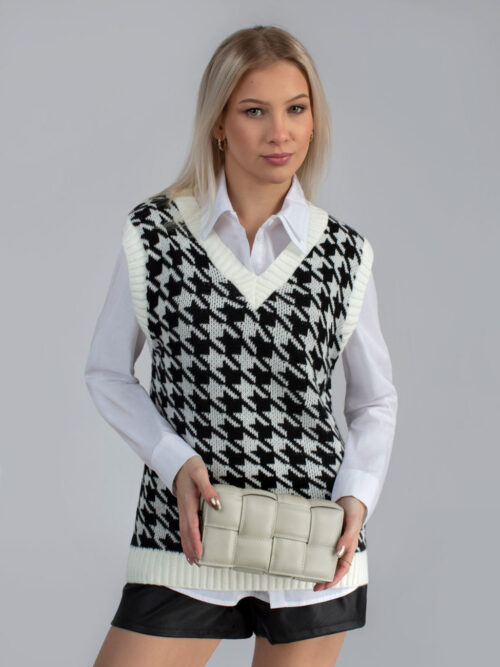 Trendy dámska pletená vesta s véčkovým výstrihom. Vesta je vyrobená z príjemného materiálu a má nesmrteľný vzor – kohútia stopa. Môžeš ju nosiť na košeľu, rolák alebo len samotnú vestu. Tento kúsok rozhodne nesmie chýbať v skrini každej srpávnej fashionistke.