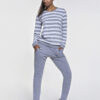 Kvalitné dámske pyžamo v príjemnej svetlo hnedej farbe. Pyžamo je vyrobené z veľmi kvalitného materiálu. Skladá sa z vrchného dielu a nohavíc. Tričko má dlhé rukávy ukončené patentom. Nohavice majú v páse gumu so šnúrkou a ukončené sú takisto patentom. Veľmi kvalitné a pohodlné pyžamo, v ktorom sa budeš cítiť zaručene príjemne.
