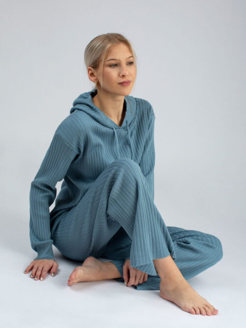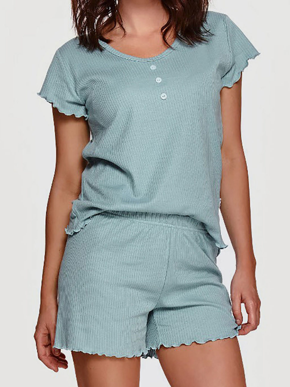 Dámske dvojdielne pyžamo je vyrobené z veľmi príjemného vrúbkovaného a mäkkého materiálu s podielom bavlny až 100%. Vrchný diel pyžama má okrúhly výstrih zdobený gombíkmi a krátke rukávy sú ukončené elegantnou vlnovkou, takisto ako spodok trička. Šortky tvoria spodný diel pyžama, v páse majú gumu a sú ukončené takisto elegantnou vlnovkou. Toto pyžamo budeš jednoducho milovať ♥