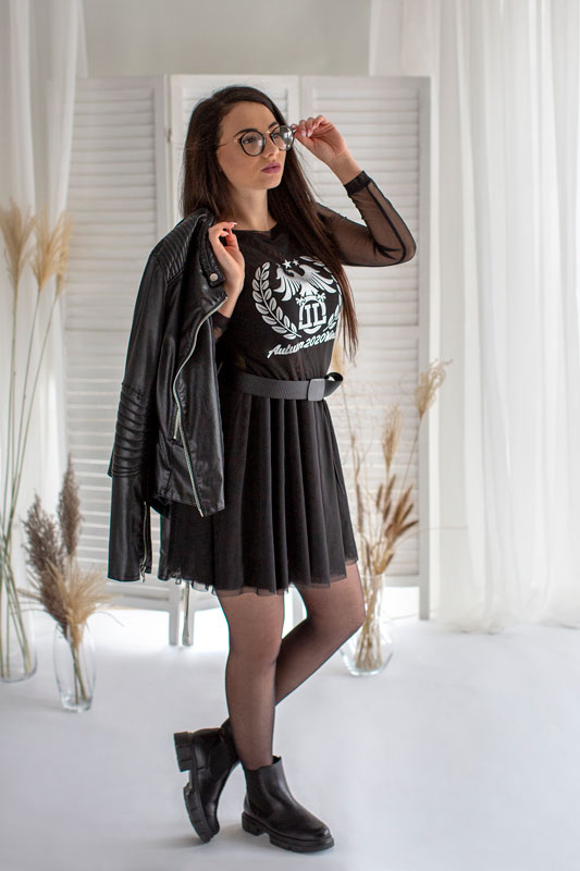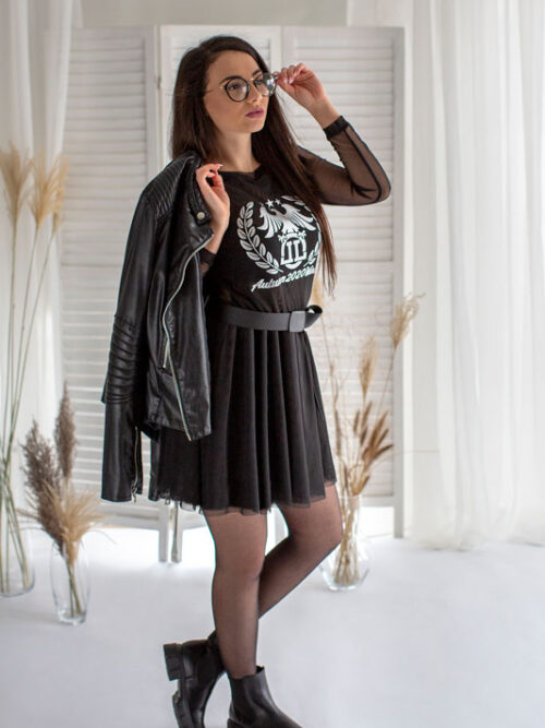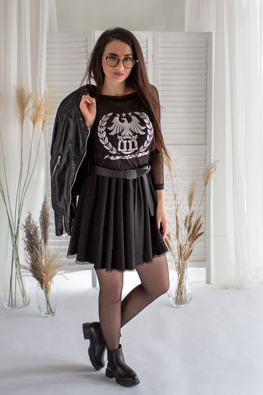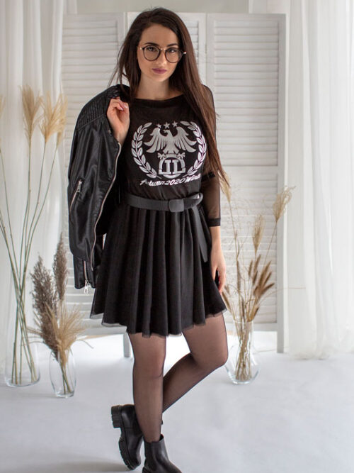 Krátke dámske trendy šaty so striebornou aplikáciou z dielne BY O LA LA v čiernej farbe.