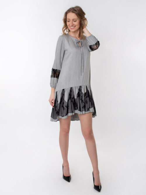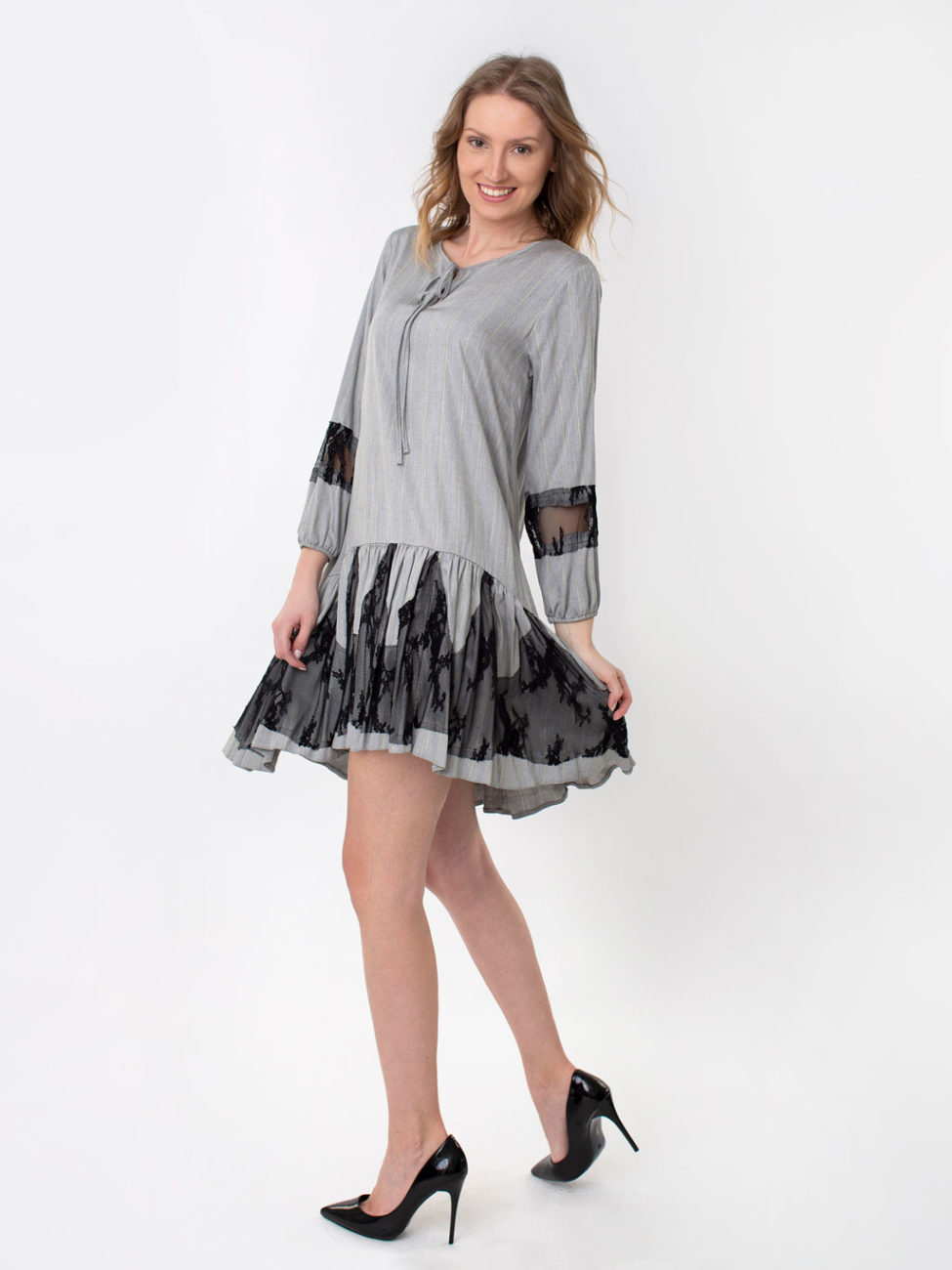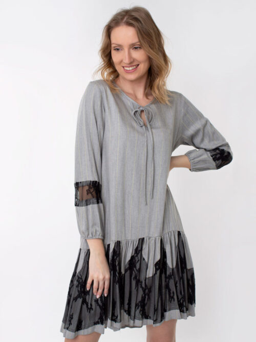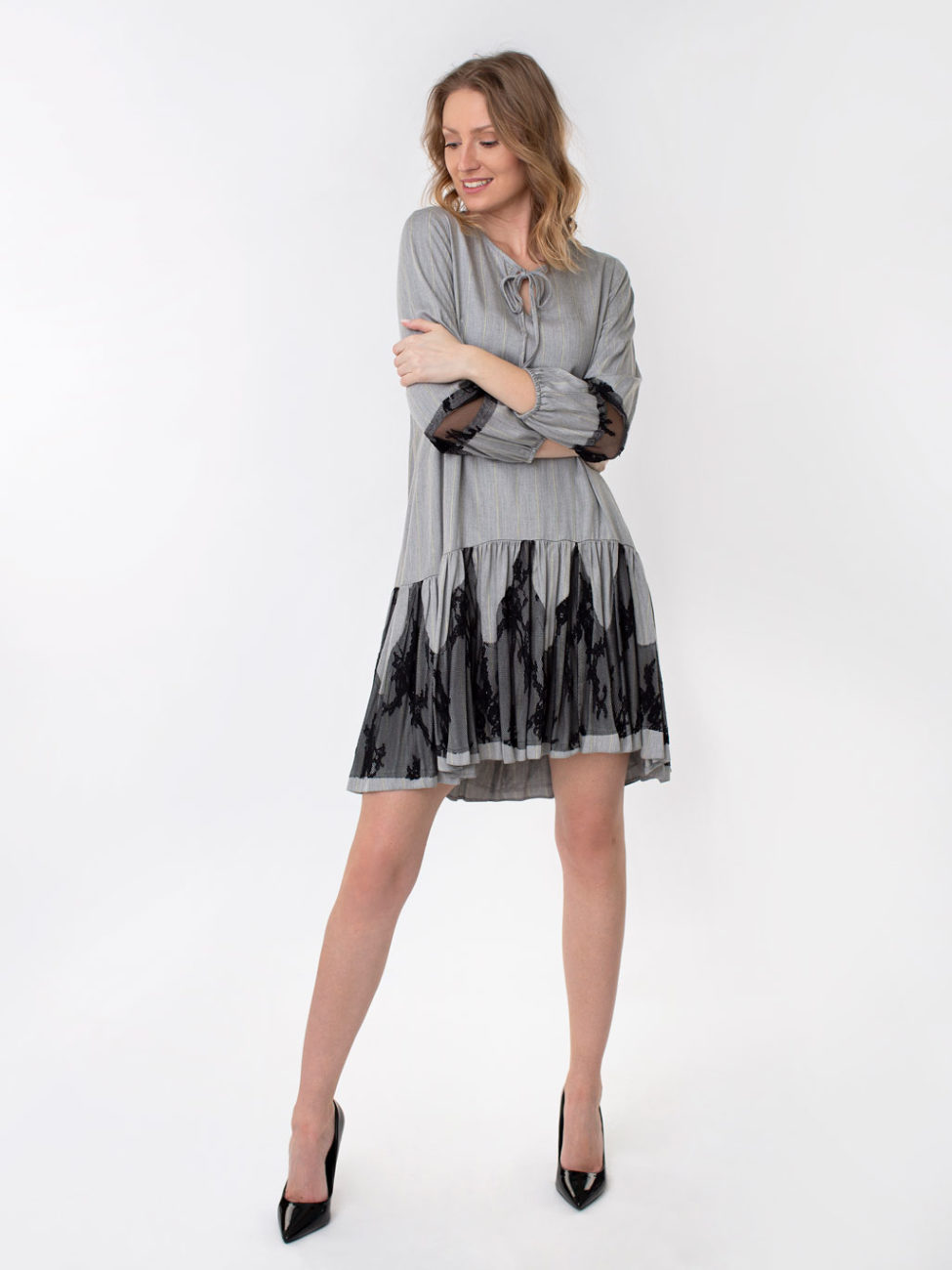 Dámske krátke šaty sú v dolnej časti ukončené volánom, ktorý je zdobený čiernou čipkou. Šaty sú z príjemného materiálu, majú dlhý rukáv v ktorom je vložená čierna čipka. Rukáv je ukončený gumičku.