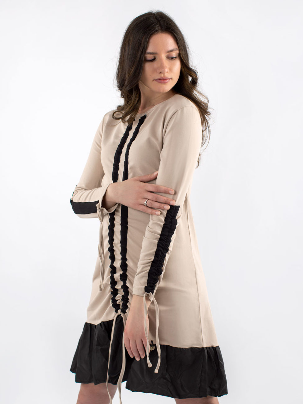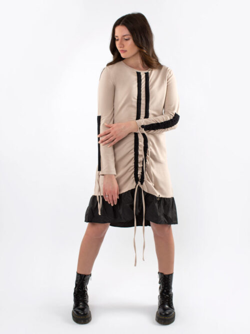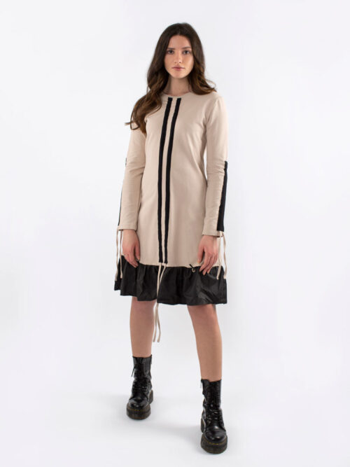 Pohodlné bavlnené šaty, ktoré sa dajú nosiť aj ako tunika. Svojou dĺžkou siahajú po kolená a sú ukončené šušťákovým volánom. Šaty sú rovného strihu, dĺžka šiat siaha po kolená ale viete si ju prispôsobiť aj vďaka nastaviteľným šnúrkam a šaty môžu vyzerať stále inak. Tak isto ako aj rukávy, ktoré sú dlhé ale stiahnutím šnúrky ich viete nastaviť na požadovanú dĺžku. Ideálny kúsok, ktorý využijete počas celého roka.
