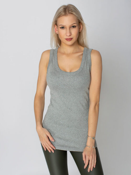 Dámske pohodlné tielko BY O LA LA s hrubými ramienkami v šedej farbe. Tielko je doplnené jemným trblietavým efektom. Vyrobené z elastického rebrovaného materiálu, ktorý formuje postavu. Skvele kombinovateľný kúsok počas celého roka.