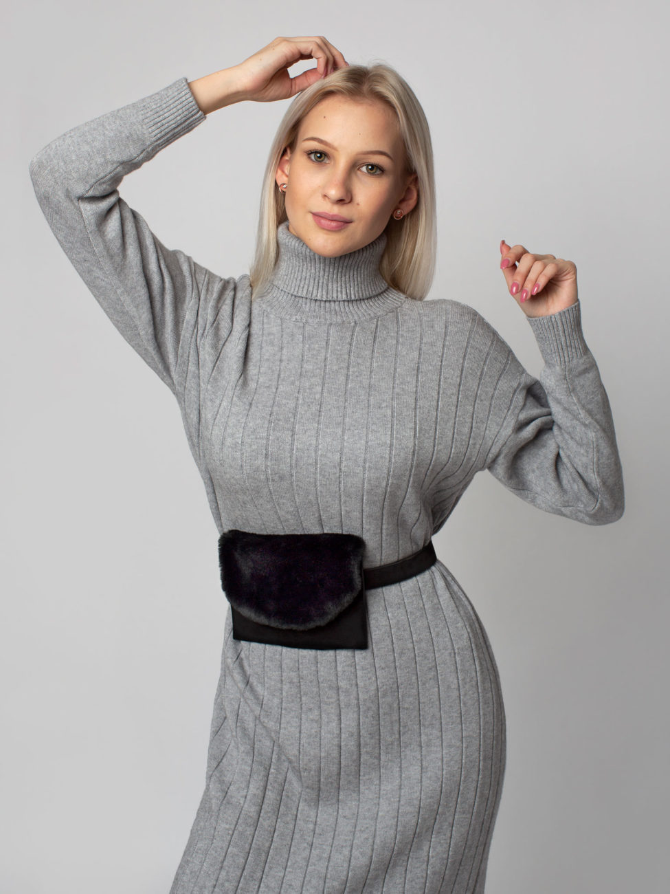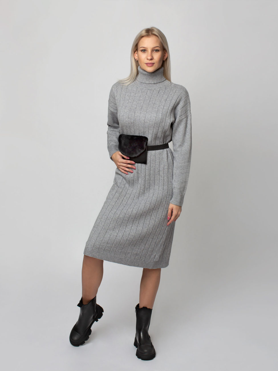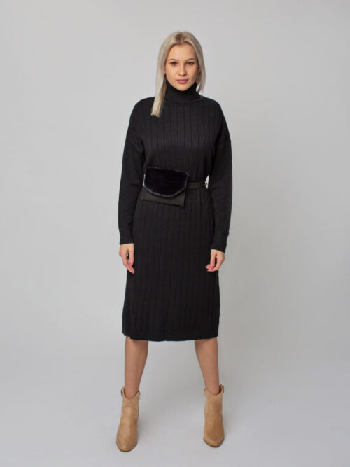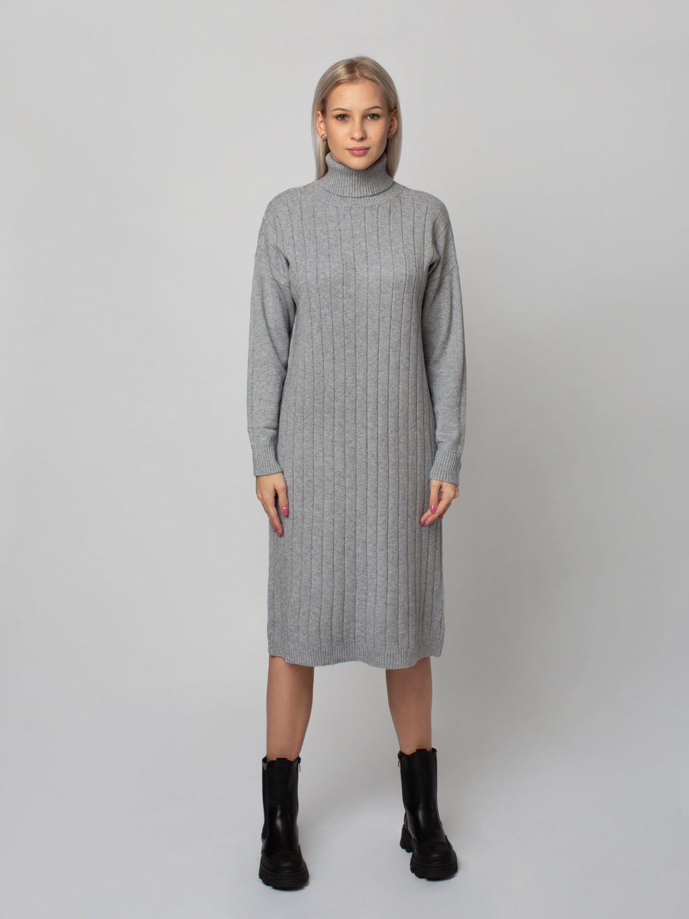 Pohodlné dámske úpletové šaty s rolákom v šedej farbe. Šaty sú vyrobené z rebrovaného, príjemného materiálu, ktorý sa pekne prispôsobí postave. Tieto šaty môžete skombinovať k čižmám ale aj k teniskám. Sú kvalitne spracované. Šaty majú dlhý rukáv a ich dĺžka siaha pod kolená.