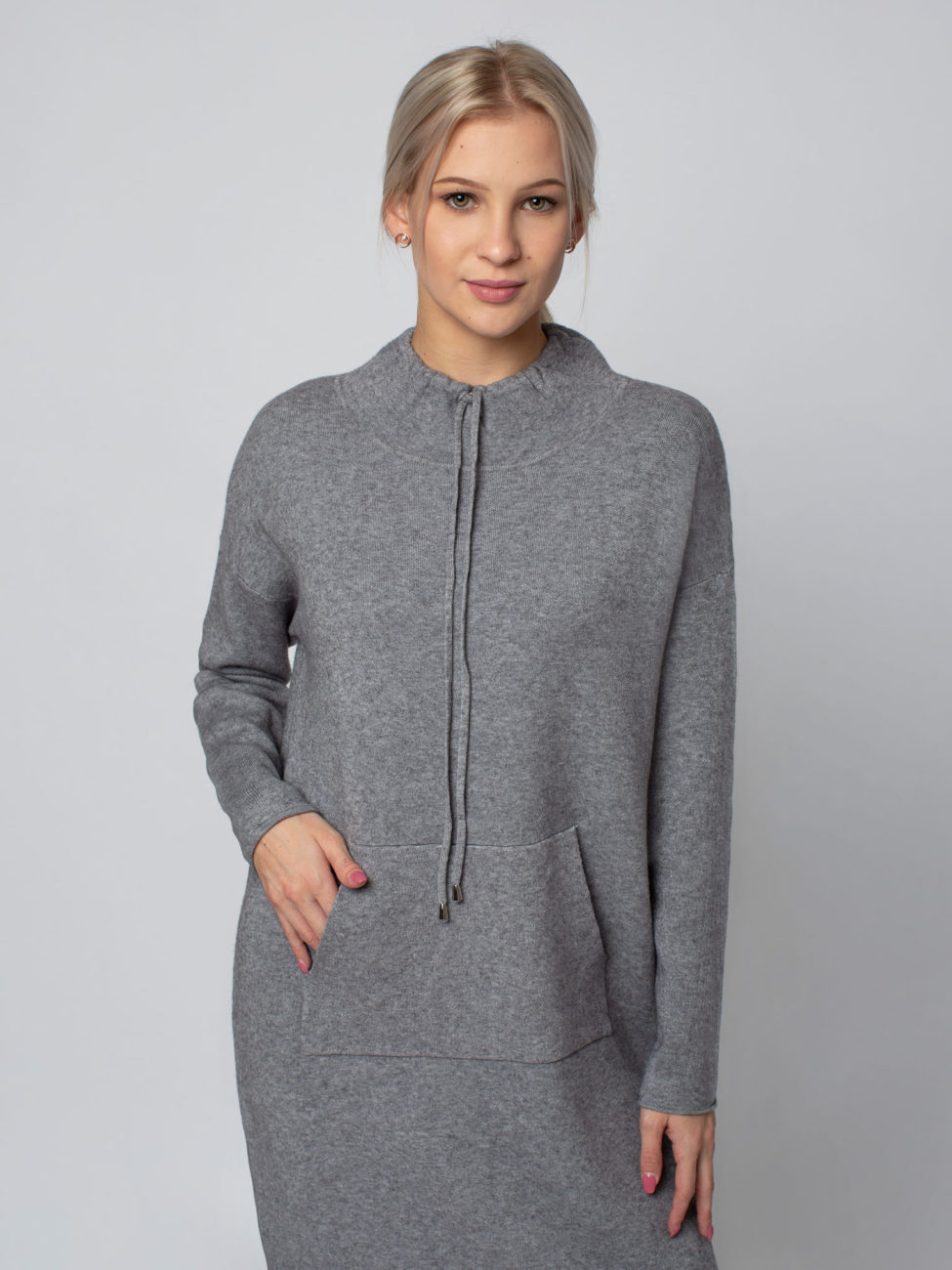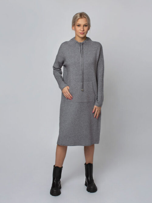 Dámske úpletové midi šaty v sivej farbe. Šaty sú doplnené sťahujúcim viazaním okolo krku a klokaním vreckom. Šaty sú voľného strihu a pekne sadnú na každú postavu.