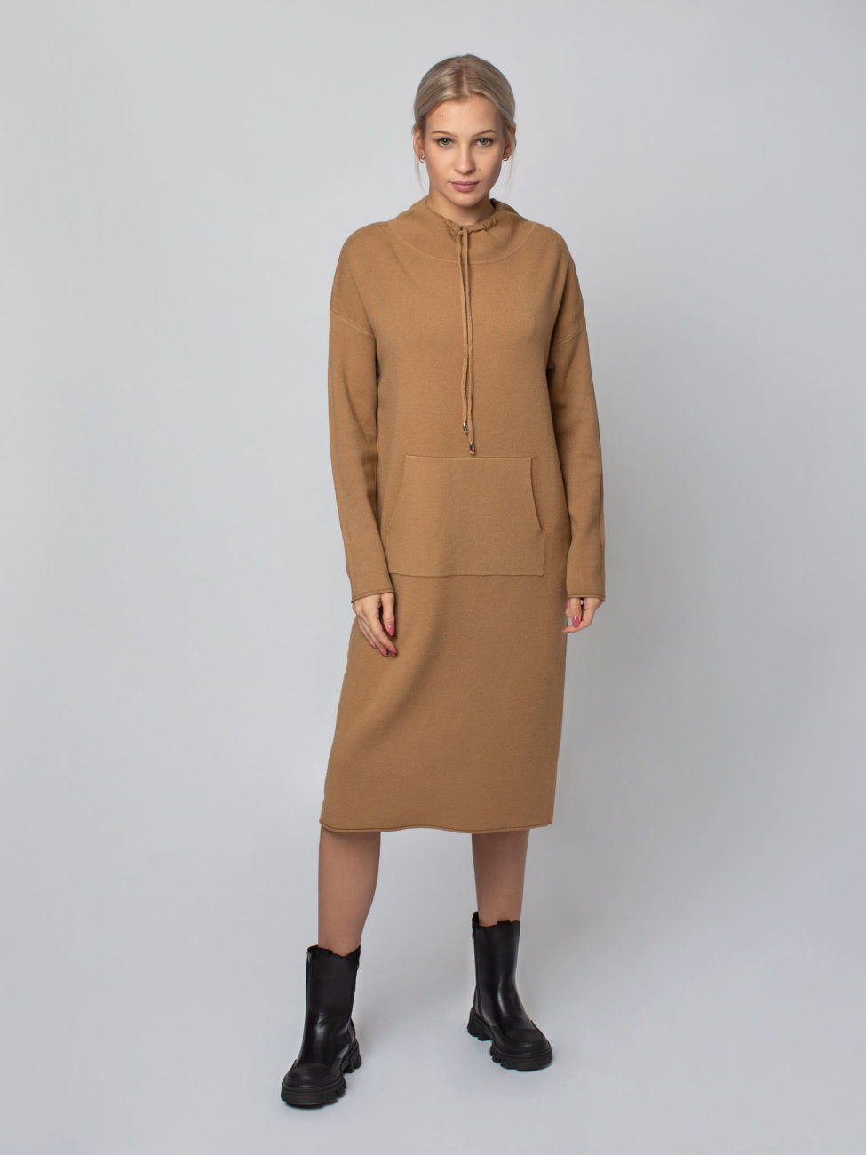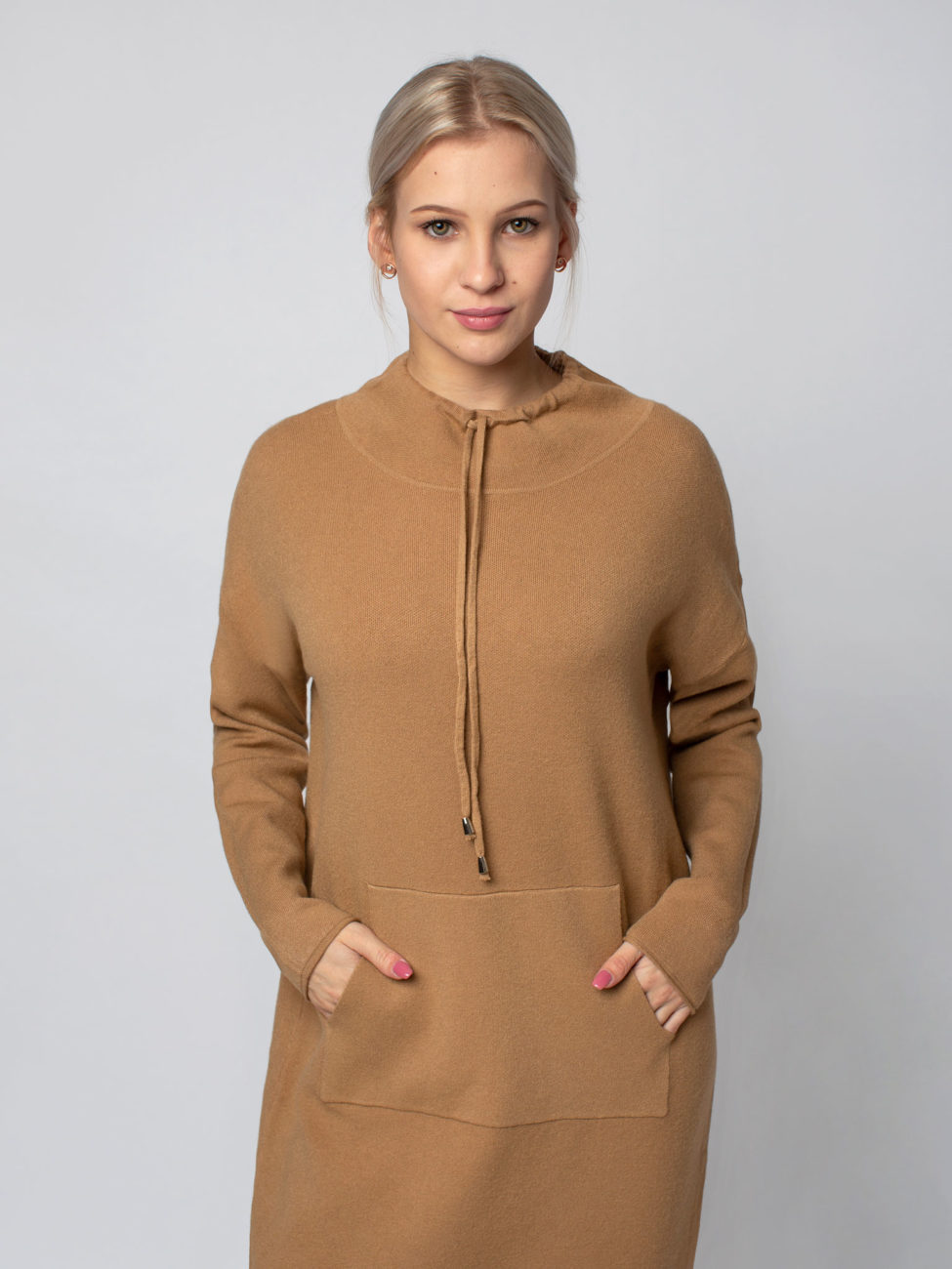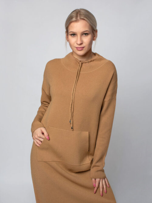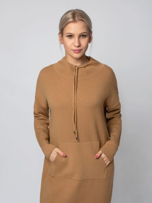 Dámske úpletové midi šaty vo farbe camel. Šaty sú doplnené sťahujúcim viazaním okolo krku a klokaním vreckom. Šaty sú voľného strihu a pekne sadnú na každú postavu.