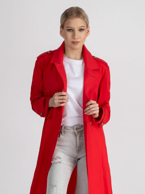Jarný plášť z dielne talianskej značky PLEASE v krásnej pútavej červenej farbe. Trenčkot je veľmi kvalitne spracovaný, vpredu sa zapína po celej dĺžke na gombíky, má bočné vrecká a je doplnený opaskom. Nadčasový kúsok, ktorý nesmie chýbať v tvojom šatníku.
