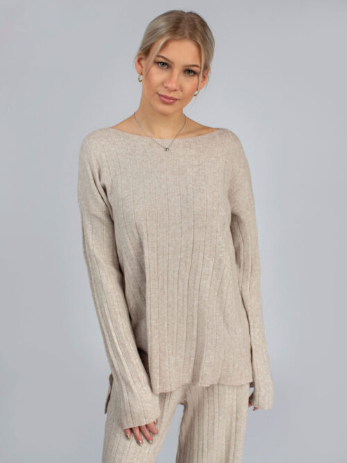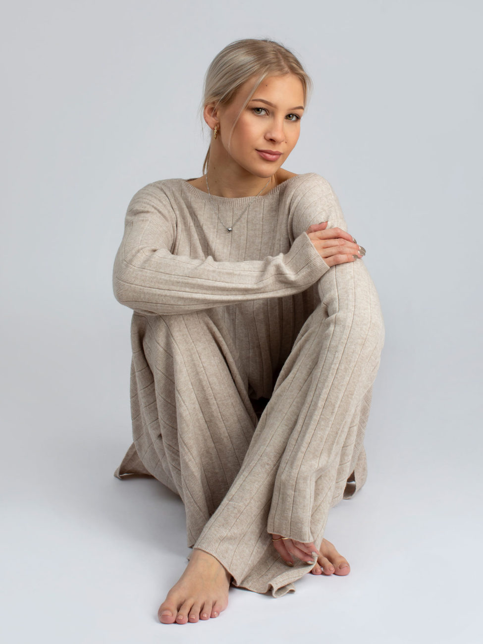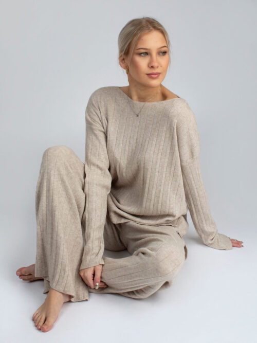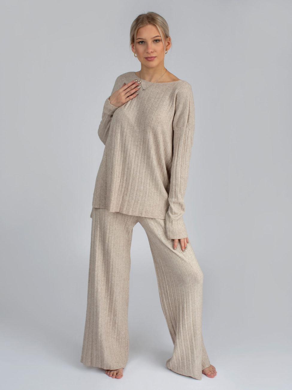 Dvojdielny béžový komplet z príjemného úpletu. Komplet je ležérneho strihu a skladá sa z nohavíc a svetra. Nohavice majú v páse gumu, vďaka ktorej sa pekne prispôsobia postave a sú pohodlné. Tento kúsok je veľmi obľúbený a pohodlný.