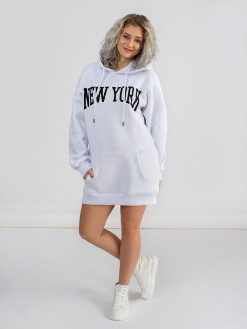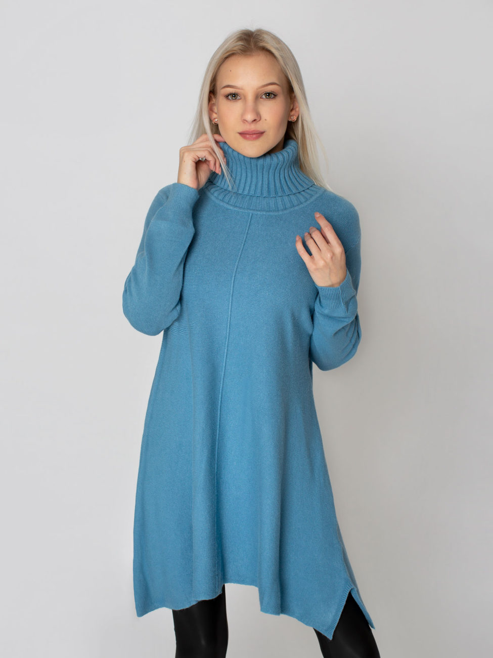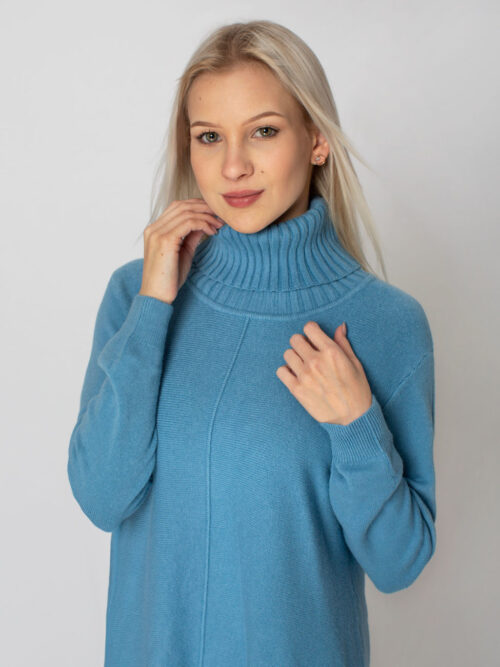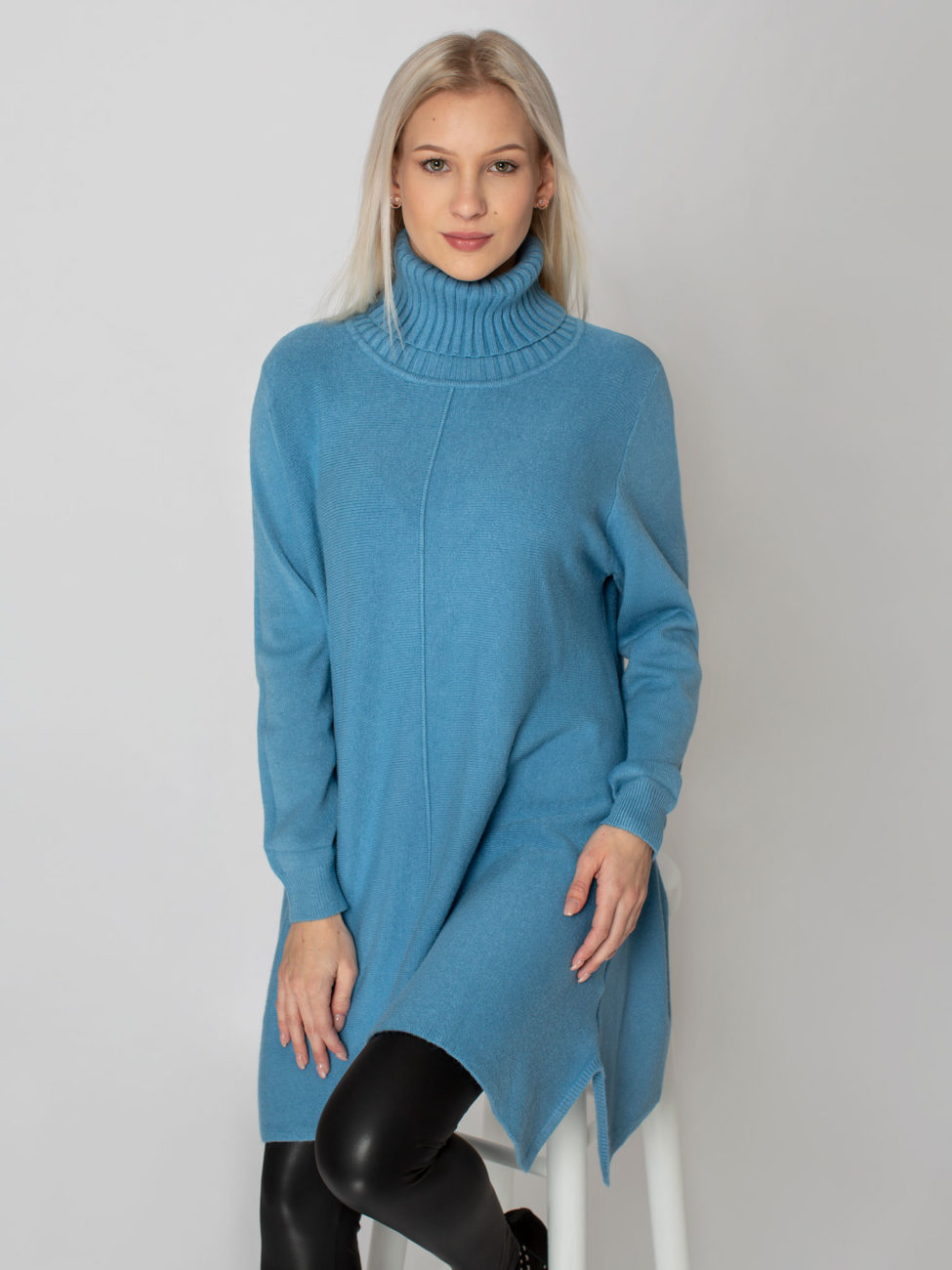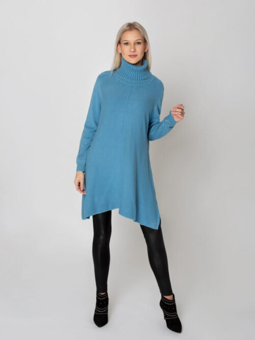 Dámsky úpletový predlžený sveter s rolákom v trendy modrej farbe. Sveter je voľnejšieho strihu a na bokoch je doplnený rozparkami. Je vyrobený z príjemného materiálu.