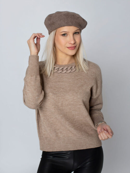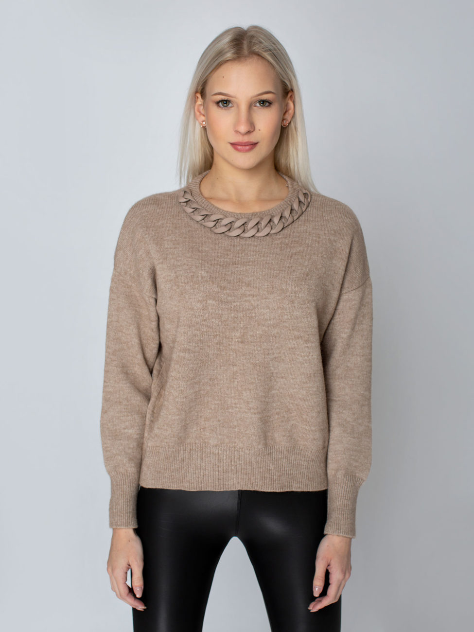 Dámsky sveter v hnedej farby kratšieho strihu. Sveter má okrúhly výstrih ozdobený decentnou reťazou okolo. Rukávy sú ukončene patentom.
