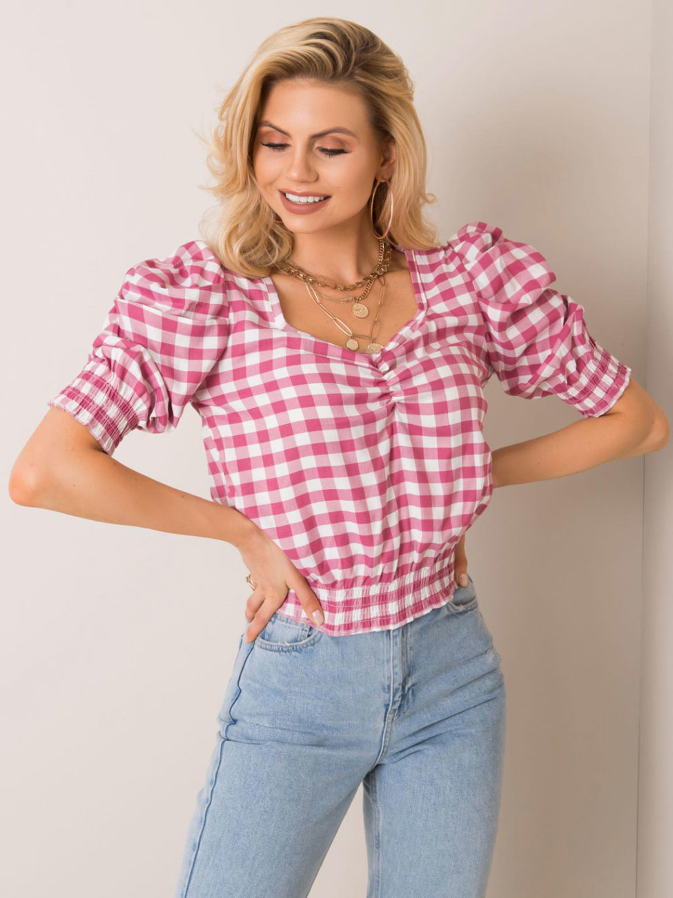 Štýlový károvaný top v ružovo bielom prevedení. Top je vyrobený z príjemného materiálu, má krátky puf rukáv ukončený gumičkou. Skvele kombinovateľný kúsok, ktorý sa hodí k džínsom, nohaviciam ale aj k sukni.