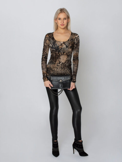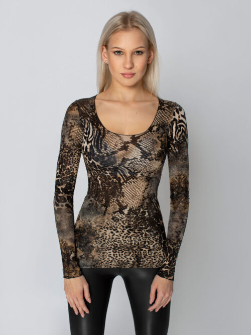 Dámsky top s dlhým rukávom a okrúhlym výstrihom v kombinácii čiernej a hnedej farby. Top je vyrobený z tenkého, jemne priehľadného materiálu.