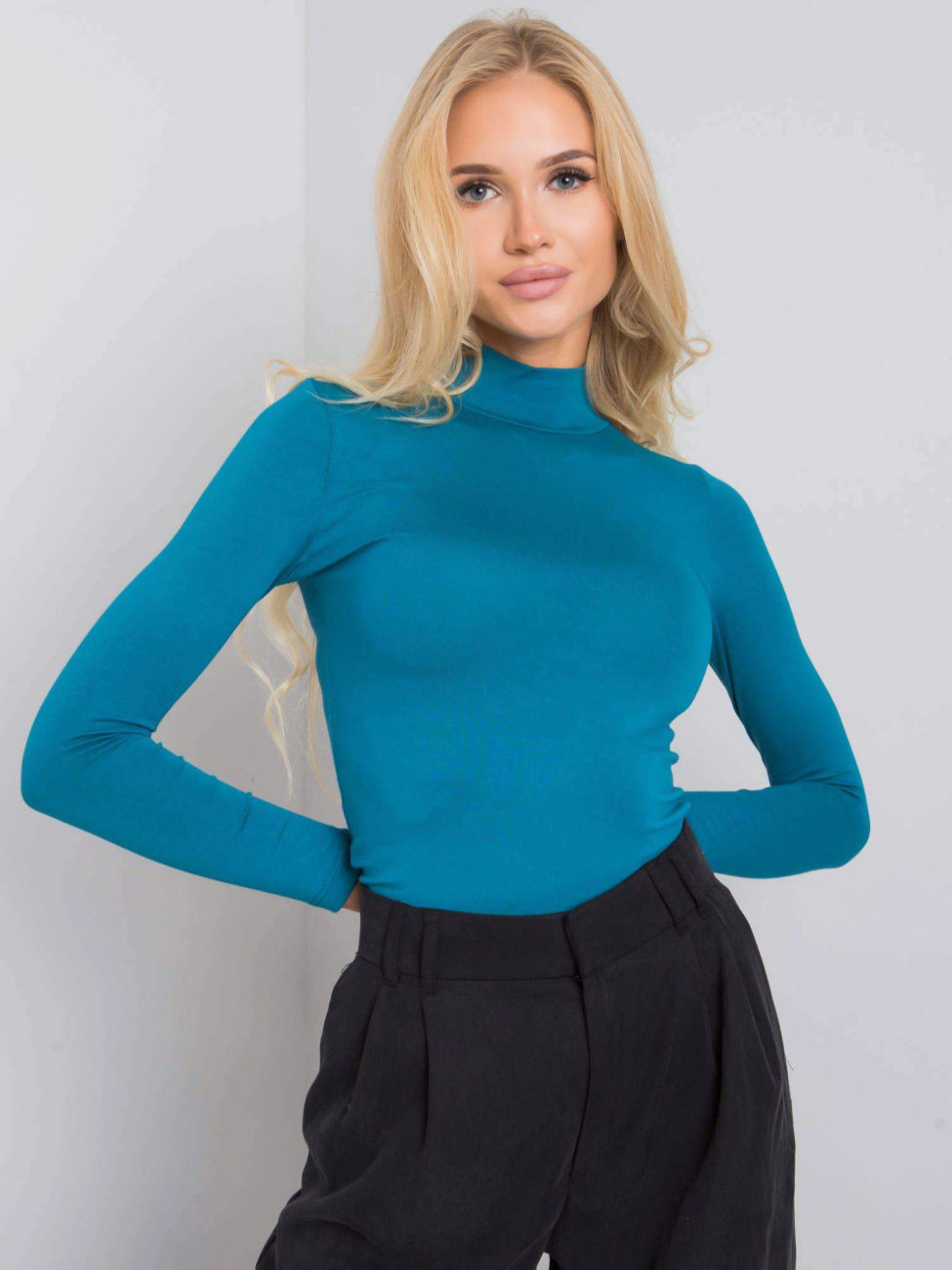 Dámsky hladký top s polorolákom v petrolejovo modrej farbe. Hladký top je určite jedným z najviac potrebných vecí v každom šatníku ženy. Je to univerzálny kúsok, ktorý sa hodí takmer ku každému štýlu a uľahčuje dotvoriť outfit. Tento jednoduchý kúsok nikdy nevyjde z módy, pretože predstavuje klasický štýl, ktorý využiješ na mnoho príležitostí. Top má dlhý rukáv a polorolák, ktorý mu dodáva elegantný vzhľad. Je vyrobený z príjemného materiálu s vysokým obsahom bavlny. Jednoducho kúsok, ktorý nesmie chýbať v tvojom šatníku.