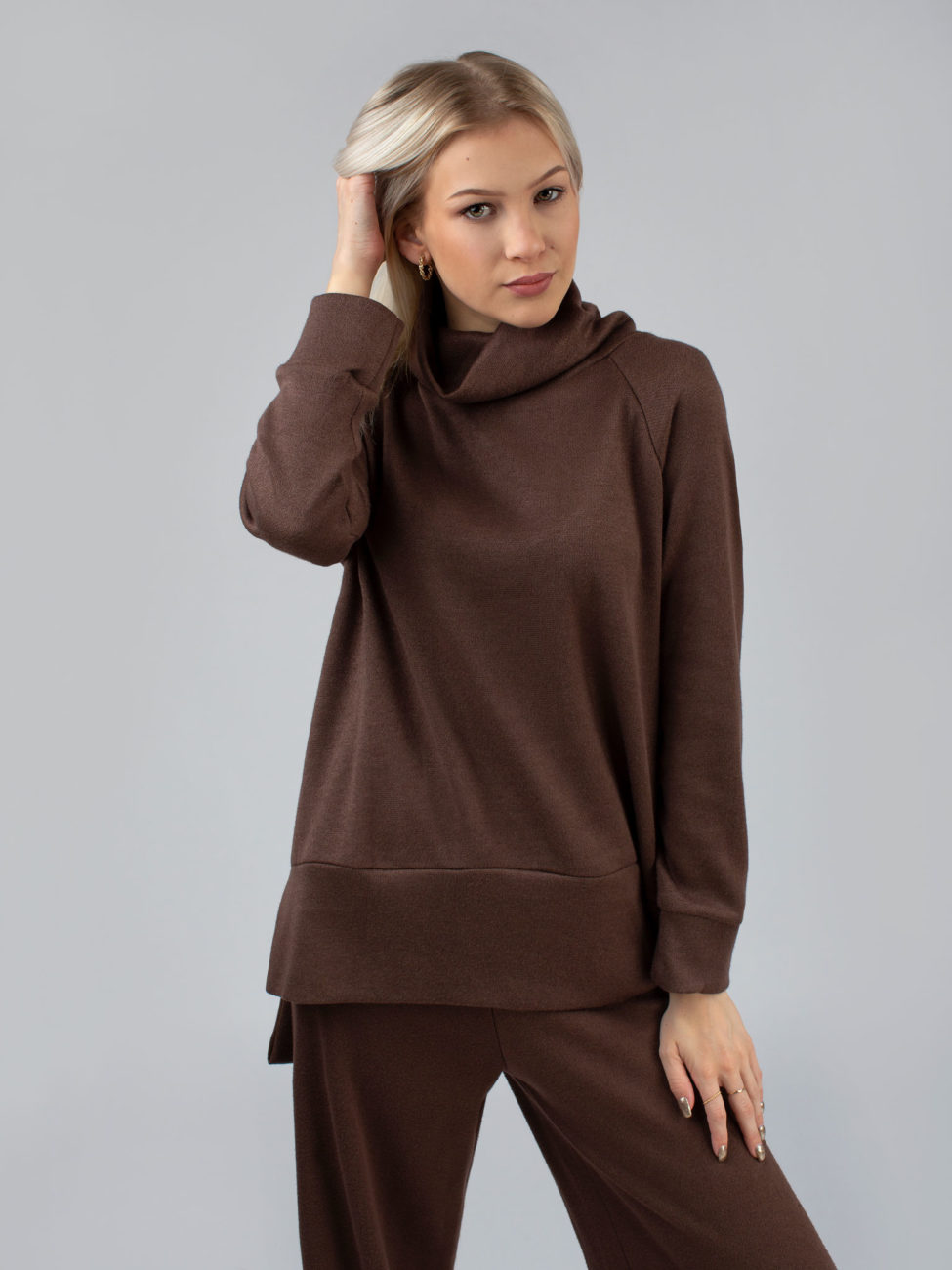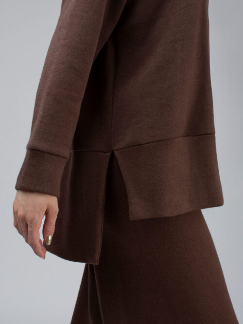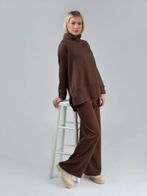 Dvojdielny komplet v hnedej farbe sa skladá z nohavíc a roláku. Komplet je ležérny, voľnejšieho strihu čo zabezpečuje pohodlie pri jeho nosení. V oblasti pásu sa nachádza guma, vďaka ktorej sa nohavice pekne prispôsobia postave. Tento kúsok je veľmi pohodlný a je vyrobený z príjemného materiálu.