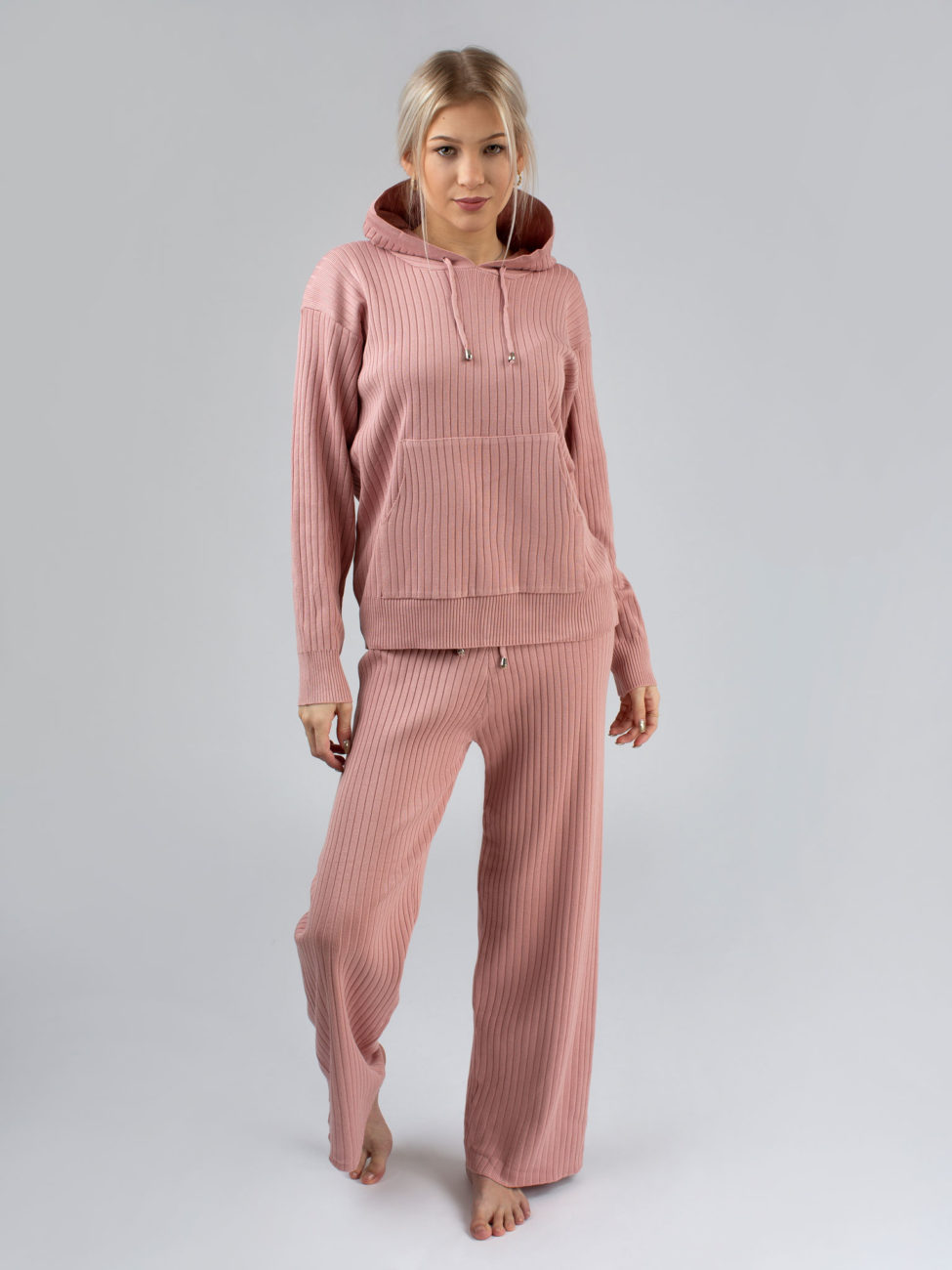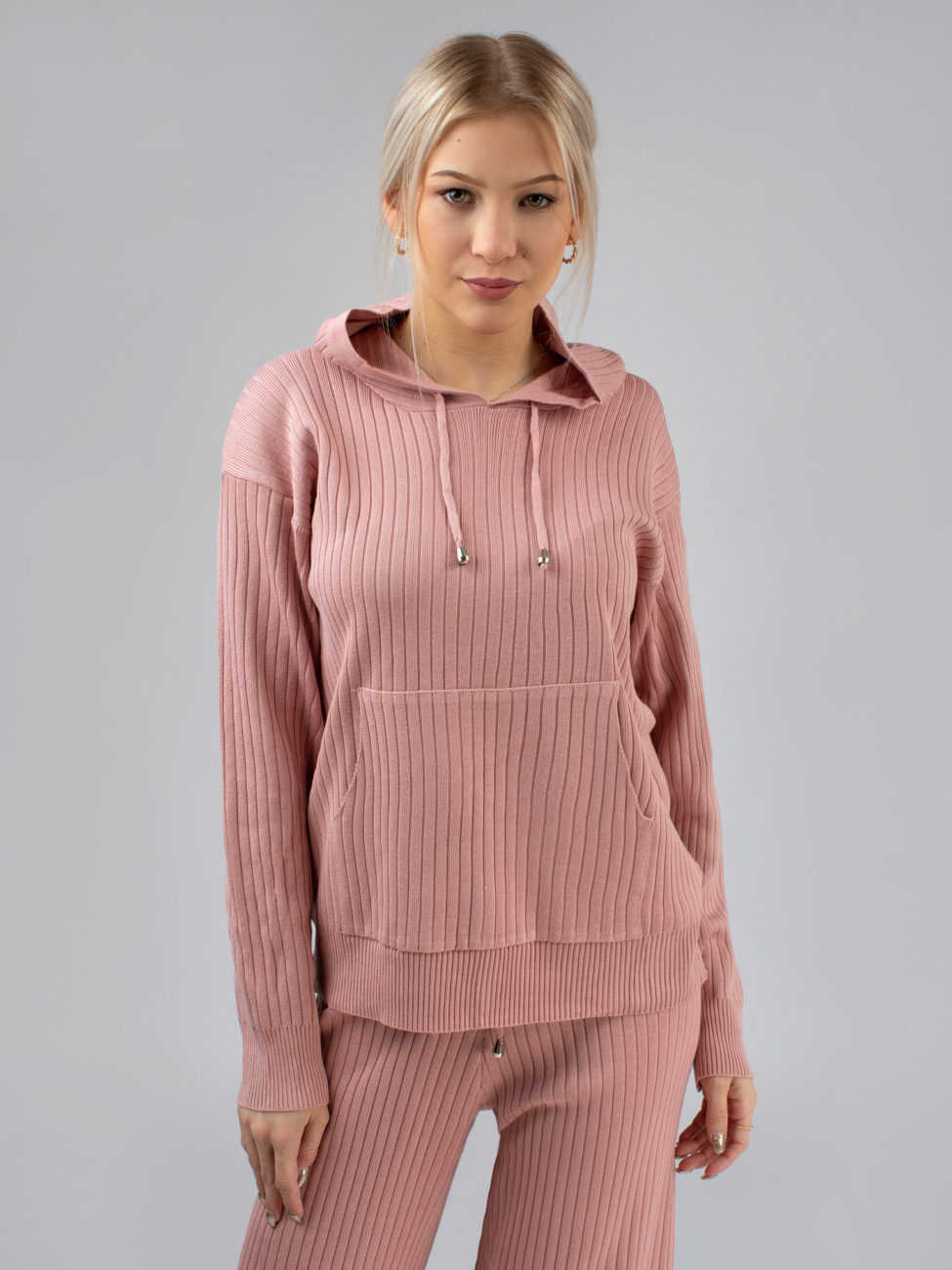 Dvojdielny ružový komplet z vrúbkovaného úpletu. Komplet sa skladá z nohavíc a svetra. Sveter má kapucňu a vpredu klokanie vrecko, jeho dĺžka siaha po bedrá. Nohavice majú v páse gumu so šnúrkou, vďaka čomu sa pekne prispôsobia postave a sú pohodlné. Tento kúsok je veľmi obľúbený a je vyrobený z príjemného materiálu.