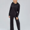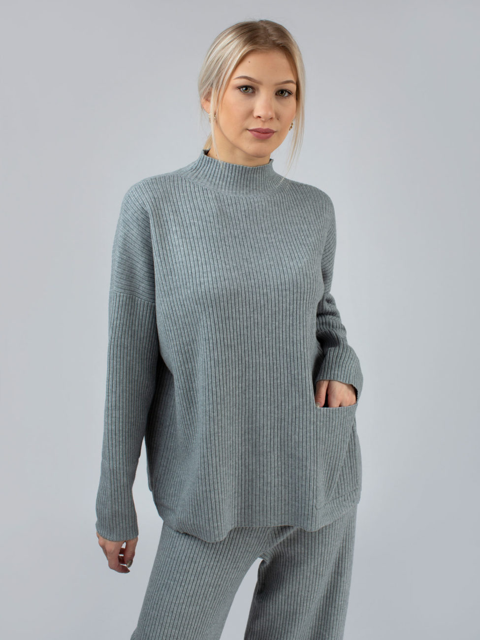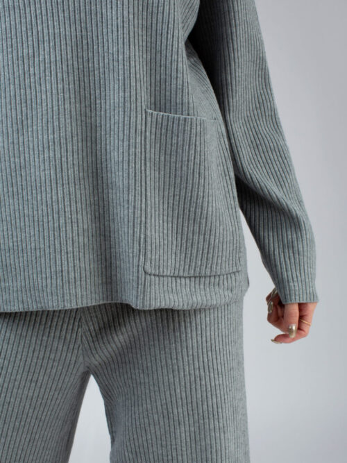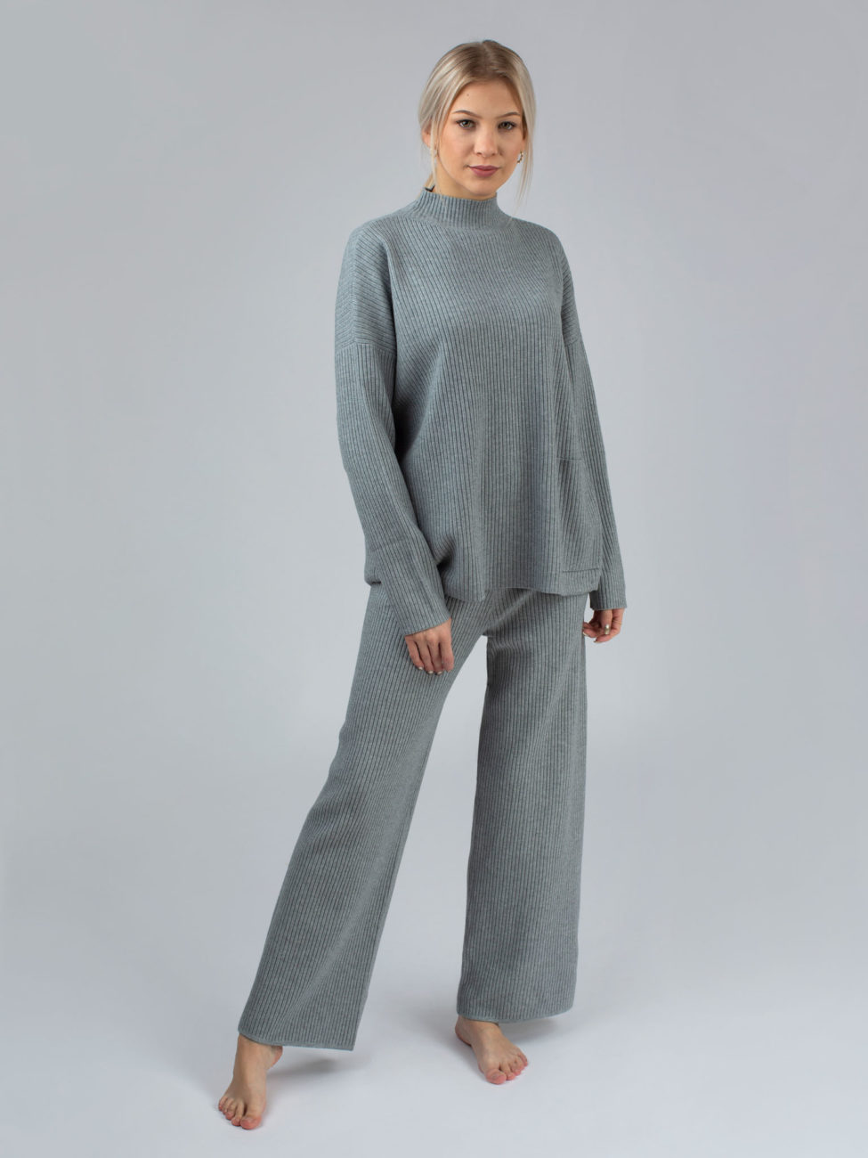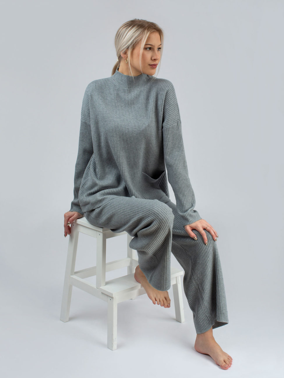 Dvojdielny sivý komplet z vrúbkovaného úpletu. Komplet sa skladá z nohavíc a svetra. Sveter je voľnejšieho strihu, vpredu ma jedno vrecko a jeho dĺžka siaha pod bedrá. Nohavice majú v páse gumu, vďaka ktorej sa pekne prispôsobia postave a sú pohodlné. Tento kúsok je veľmi obľúbený a je vyrobený z príjemného materiálu.