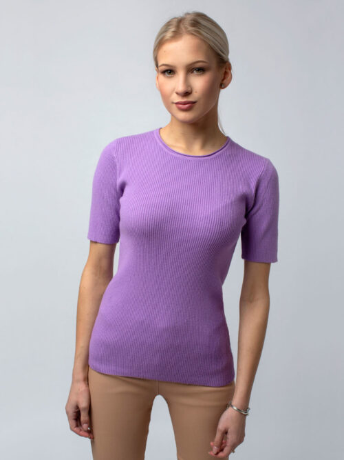 Dámsky top z príjemného vrúbkovaného materiálu fialovej farby. Top má krátky rukáv a okrúhly výstrih. Pohodlný kúsok, ktorý si určite zamiluješ.