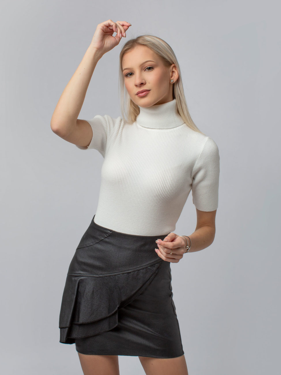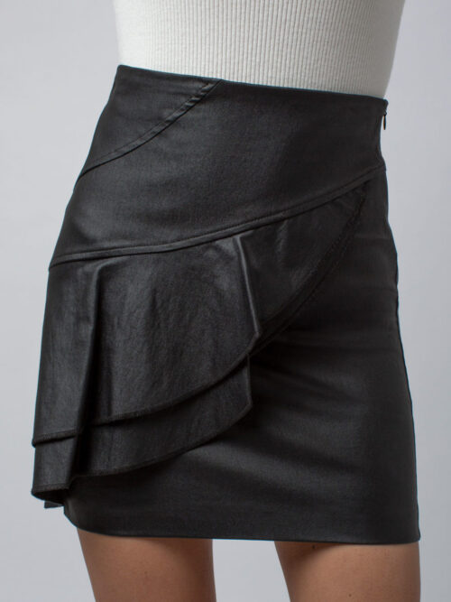 Koženková mini sukňa v čiernej farbe z talianskej dielne PLEASE. Sukňa je v prednej časti ozdobená volánom, praktické zapínanie na boku.