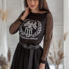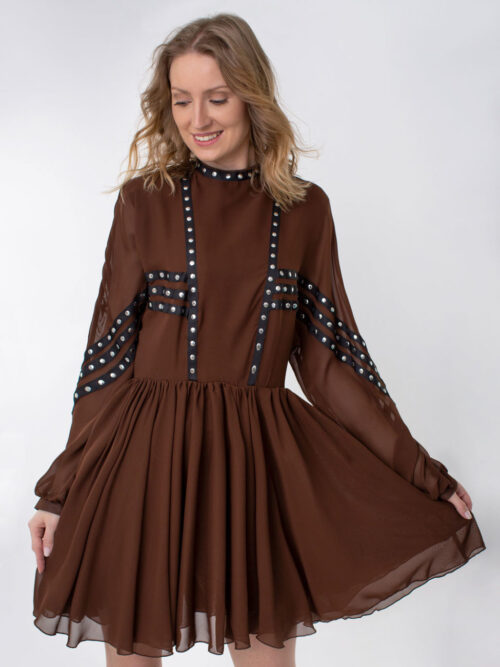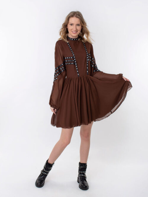 Krátke šifónové dámske šaty BY O LA LA z príjemného materiálu v hnedej farbe. Šaty sú v hornej časti zdobené striebornými nitmi, ktoré im dodávajú originálny charakter.
