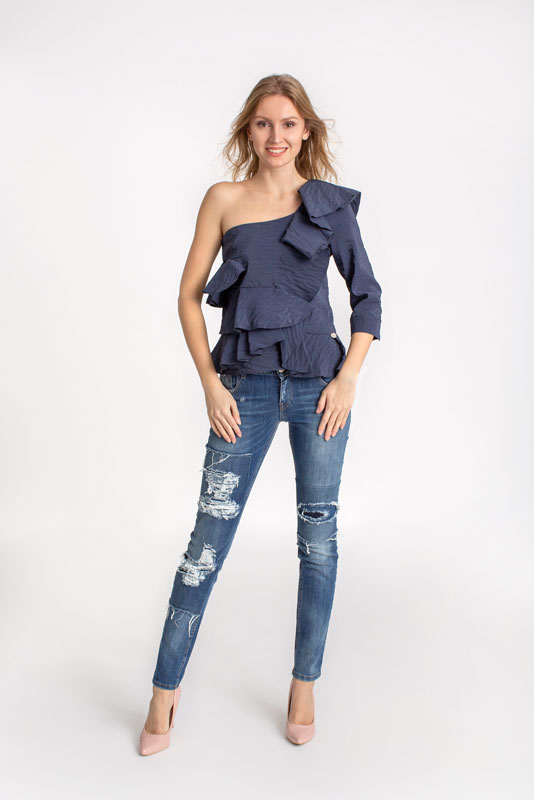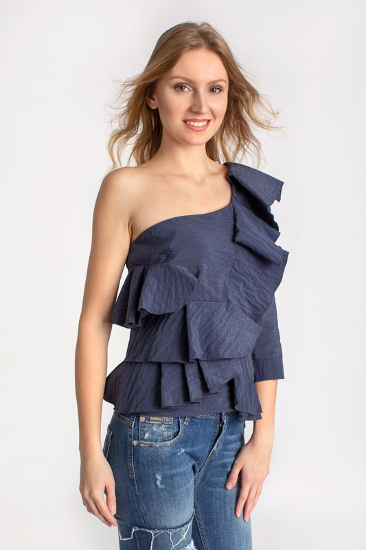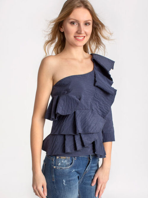 Luxusná dámska blúzka BABYLON na jedno rameno v modrej farbe.