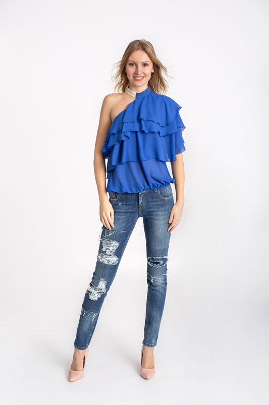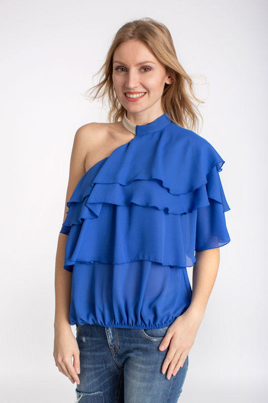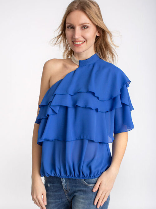 Luxusná dámska blúzka s volánmi na jedno rameno BABYLON v modrej farbe.