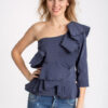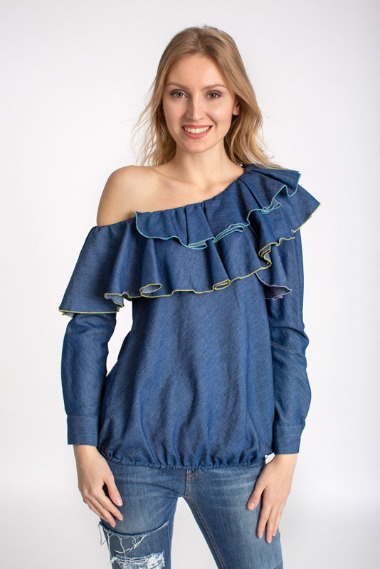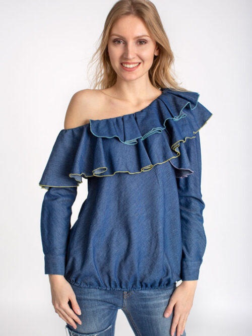 Luxusná dámska rifľová blúzka na jedno rameno s volánmi BABYLON v modrej farbe.