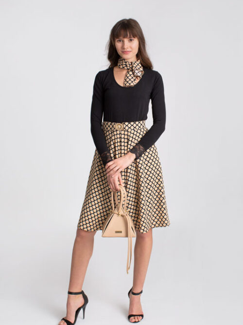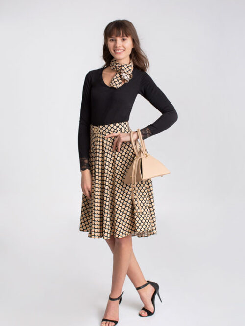 Luxusná sukňa áčkového strihu BABYLON s celoplošným vzorom a príjemným ľahko udržiavateľným materiálom. Ženský štýl na veľa príležitostí. Zapínanie je riešené skrytým zipsom na zadnej strane sukne. Opasok nie je súčasťou sukne!