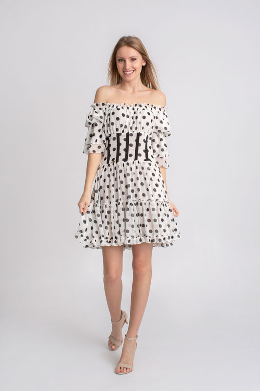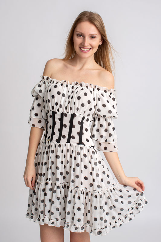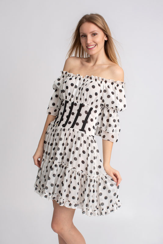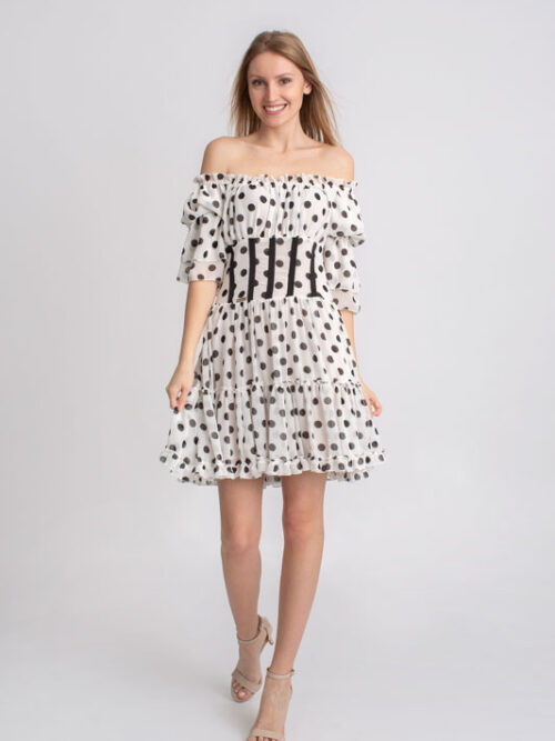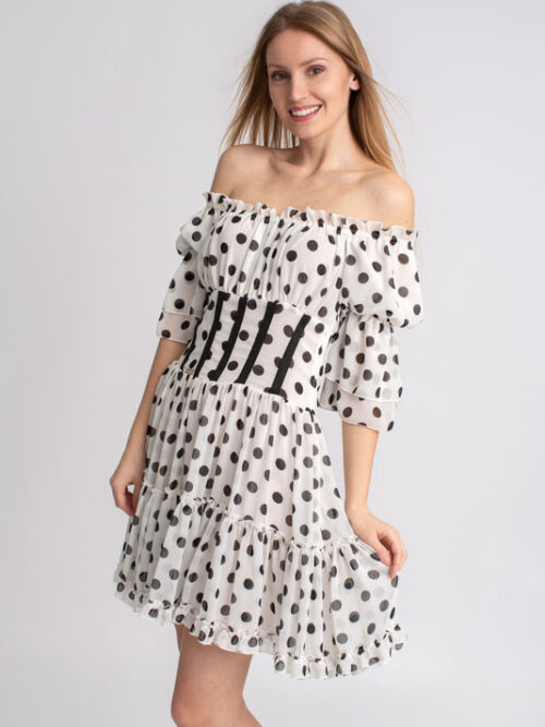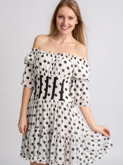 Luxusné bodkované mini šaty BABYLON v bielo čiernej farbe.