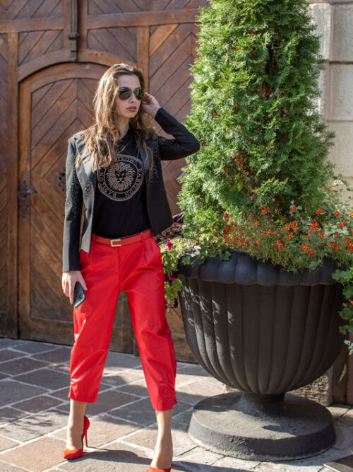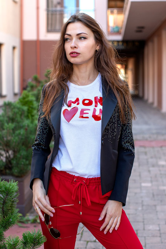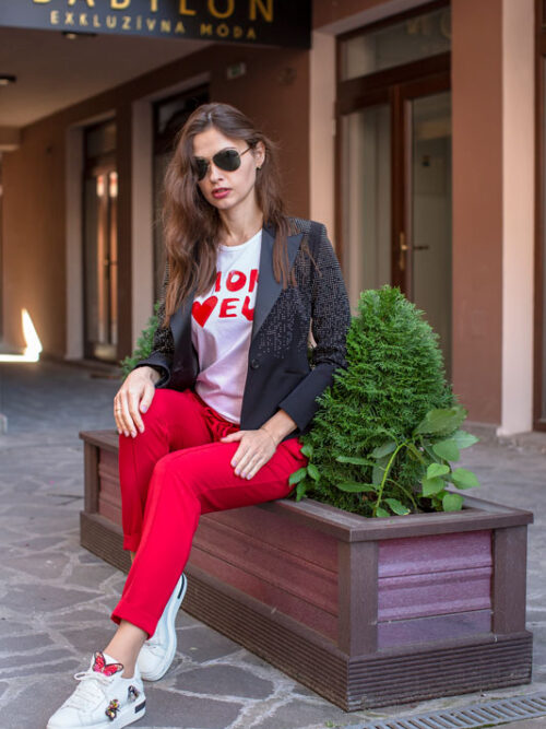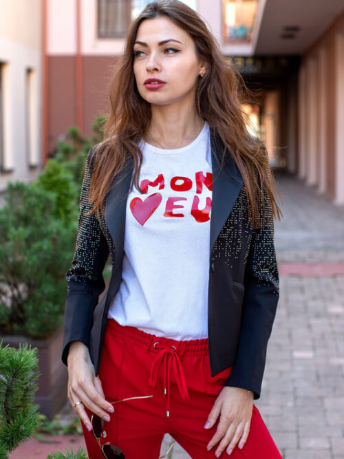 Luxusné dámske sako LES BOURDELLES v čiernej farbe zvýraznené striebornými kamienkami.