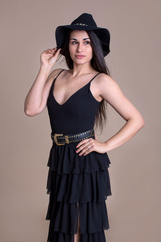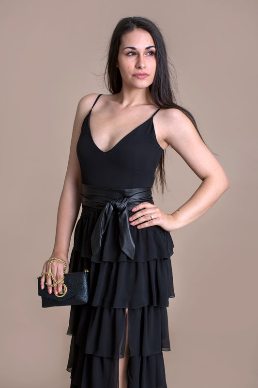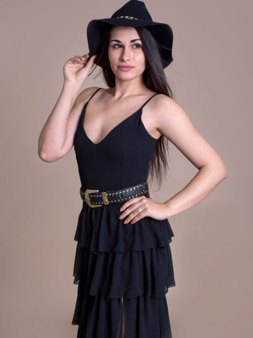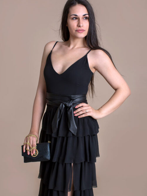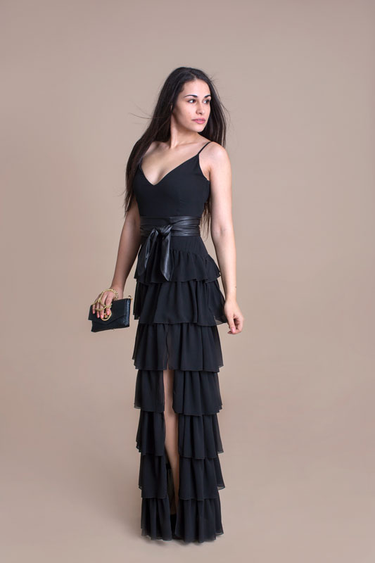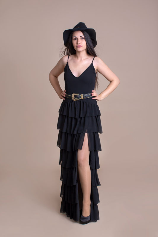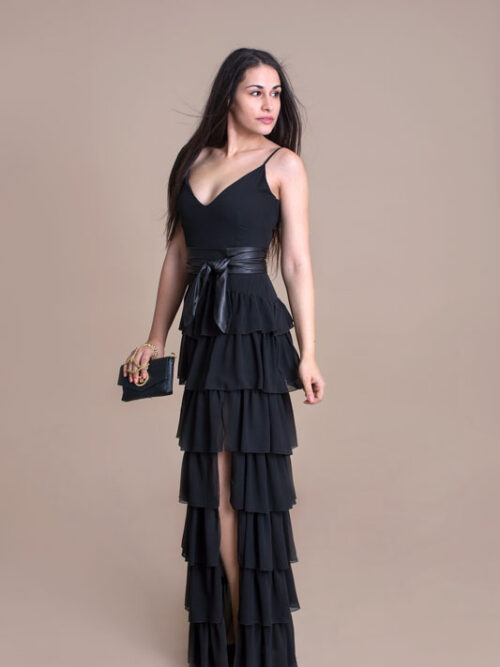Luxusné dlhé šaty BABYLON s volánmi majú pevný zvršok a bohatú volánovú sukňu s rázporkom, ktorý siaha do polovice stehien. Ako doplnok je kožený opasok.