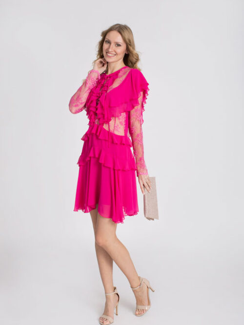 Luxusné šaty s čipkou v cyklamenovej farbe, značka BABYLON sú čarokrásnym kúskom do vášho šatníka. Šaty sú zdobené krásnou transparentnou čipkou. Suknička je áčkového strihu s volánmi. Tieto šaty sú pravým pútačom pohľadov.