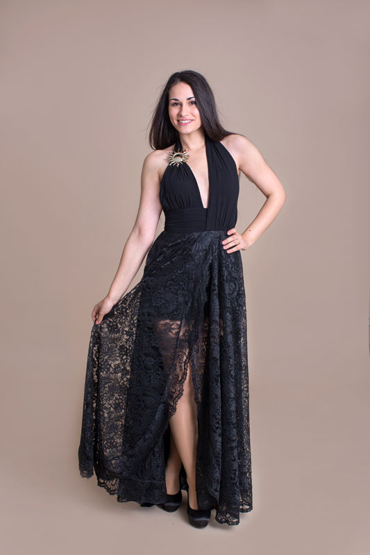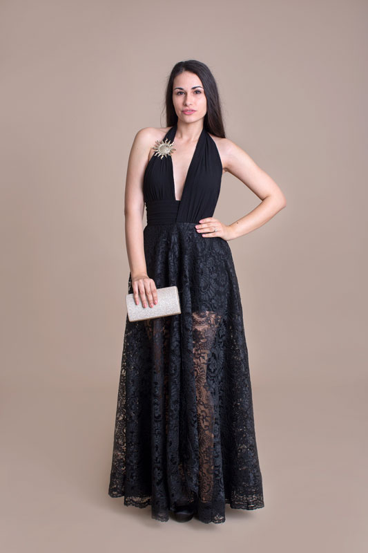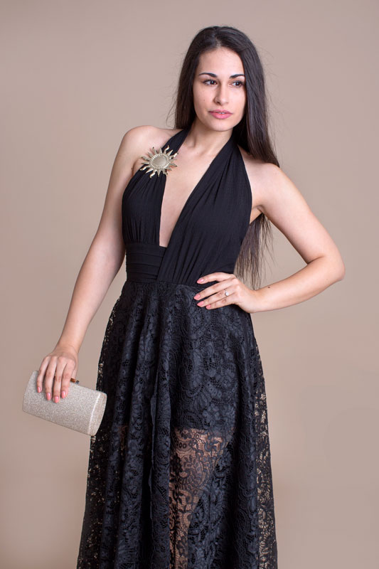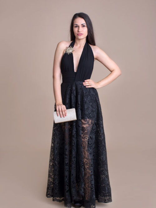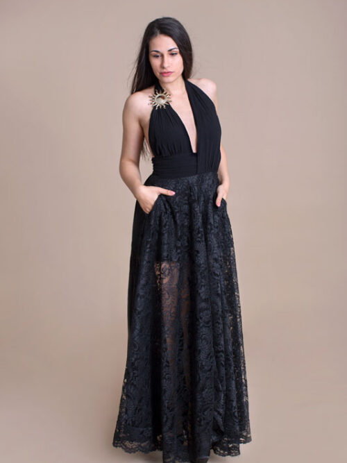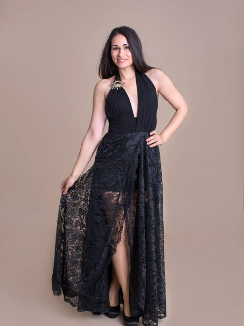 Luxusné spoločenské dlhé šaty BABYLON s čipkou. Predný diel má hlboký výstrih zdobený krásnou brošňou a vzadu odhalený chrbát. Bohatá suknička je doplnená bočnými vreckami. Šaty sú božsky extravagantné a sexi.