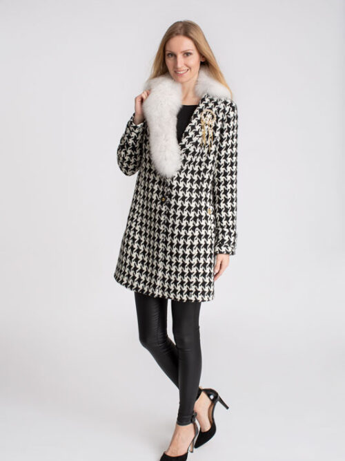 Luxusný dámsky kabát ROBERTA BIAGI predstavuje dokonalú kombinciu jednoduchého strihu a jedinečného vzoru látky „kohútia stopa“. Kabát je podšitý podšívkou a má jednoradové zapínanie. Kabát zdobí pekná jemná pravá kožušinka a na druhej strane zlatá brošňa. Pepito, alebo ak chcete kohútia stopa je jedným z trendových vzorov, ktoré snáď nikdy nepadnú do zabudnutia.