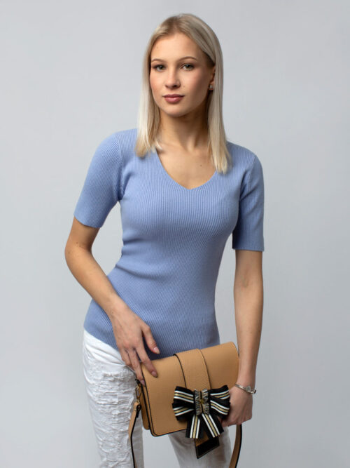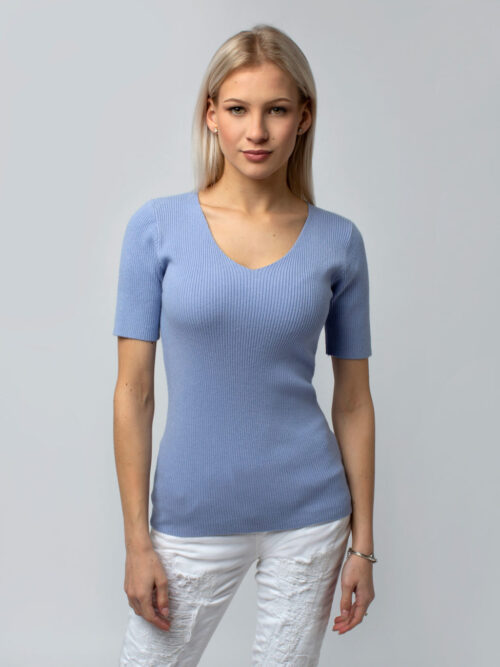 Dámsky top z príjemného vrúbkovaného materiálu v modrej farbe. Top má krátky rukáv a V-čkový výstrih. Pohodlný kúsok, ktorý si určite zamiluješ.