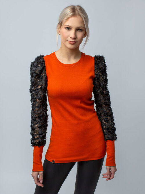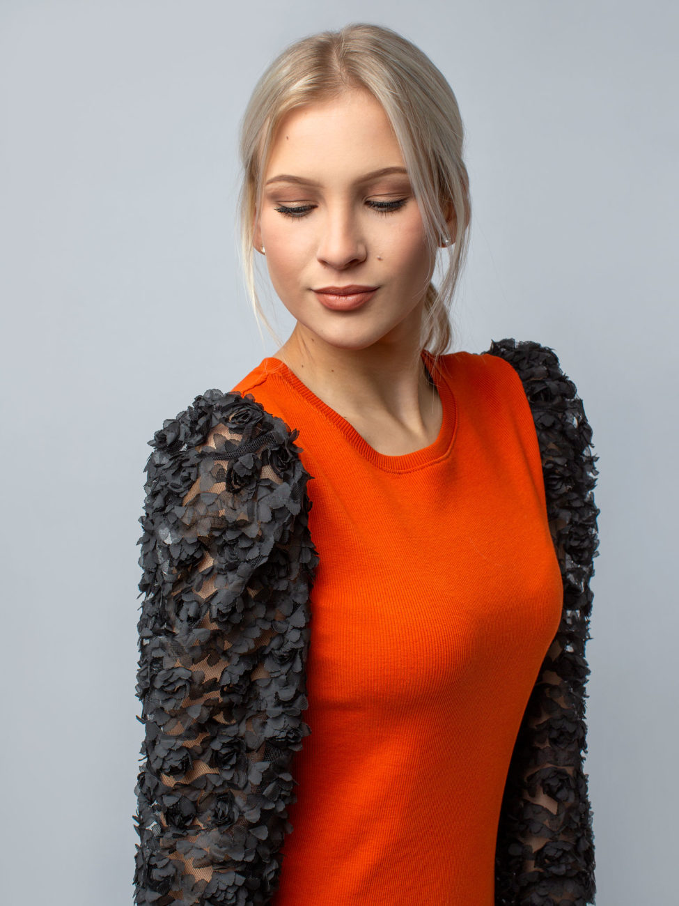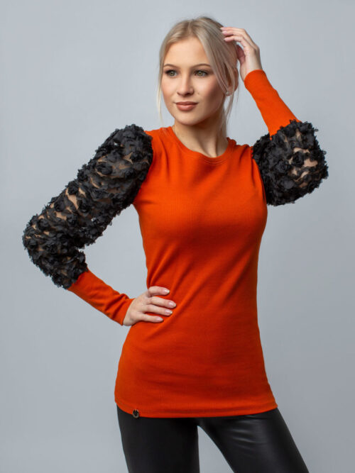 Trendy oranžový dámsky top je vyrobený z príjemného vrúbkovaného materiálu, ktorý je odolný voči opotrebeniu. Priehľadný rukáv s aplikáciou 3D kvetov doplňuje jeho výnimočný look. Výrazný a jedinečný kúsok, v ktorom určite zažiariš!
