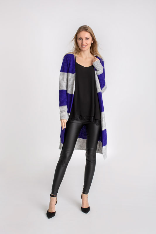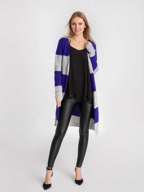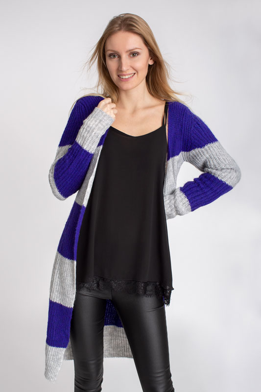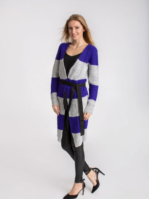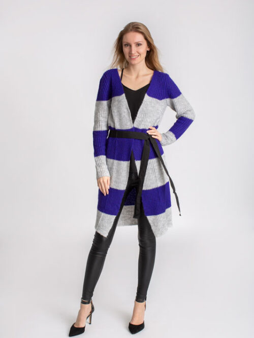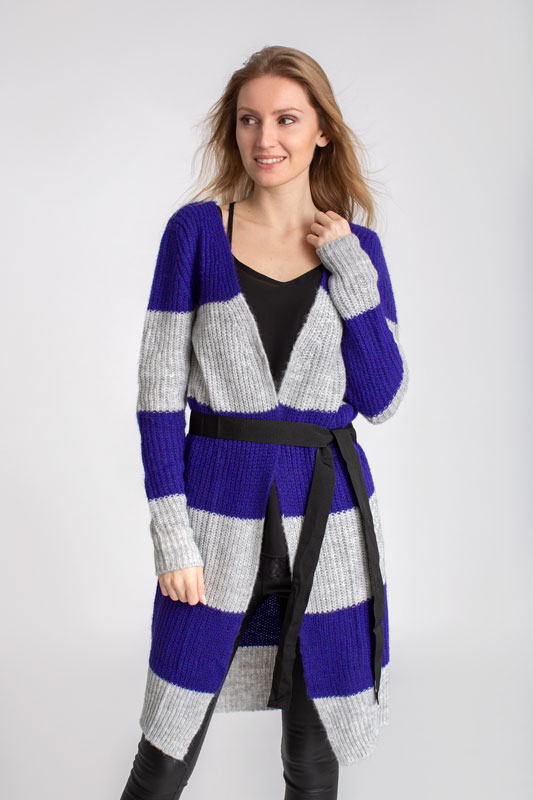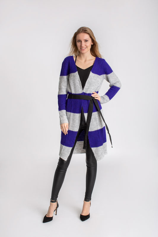Pletený kardigán SEXY WOMAN viac pristane voľnočasovej a ležérnej móde. Pekný pletený pruhovaný kardigán je doplnený opaskom. Je jednoducho kombinovateľný pre každú postavu. Pre elegantný outfit je vhodné doplniť topom, alebo košeľou a pre športový outfit zase tričko, džínsy a tenisky.