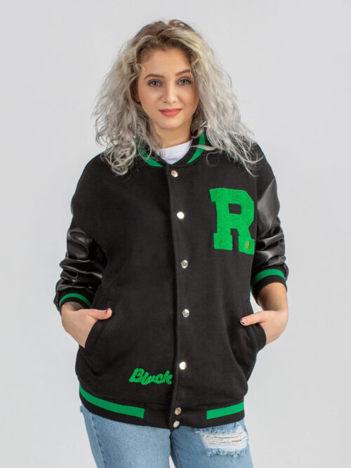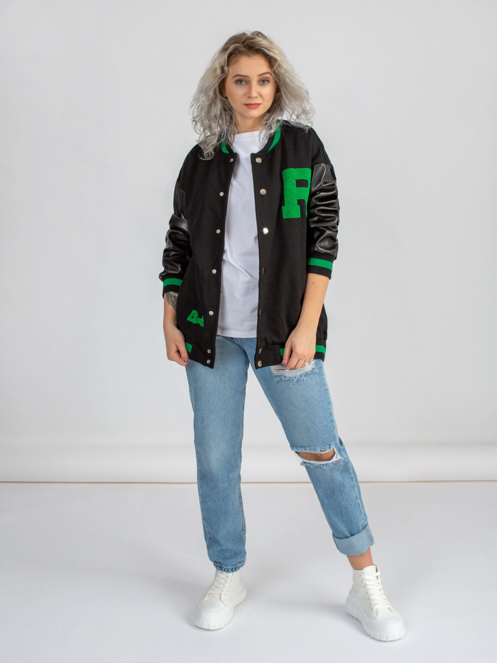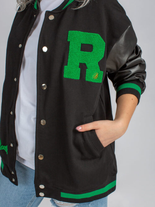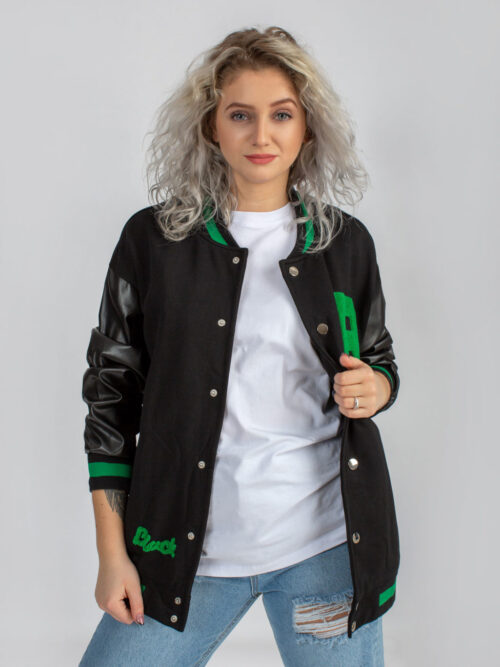 HIT tejto sezóny – baseballová bunda! Prechodná bunda v čiernej farbe je vyrobená z teplákoviny a rukávy sú z mäkkej koženky. Bunda je voľnejšieho strihu, čo zaručuje pohodlie pri nosení. Zapína sa vpredu na cvoky. Vzadu je hladká bez vzoru. Bunda nie je podšitá. Kúsok, ktorý nesmie chýbať v tvojom šatníku.