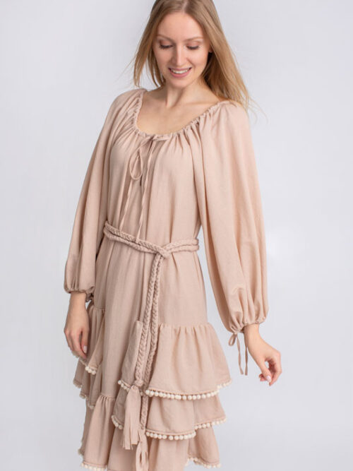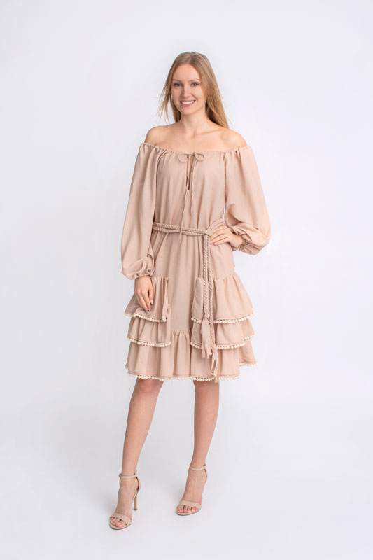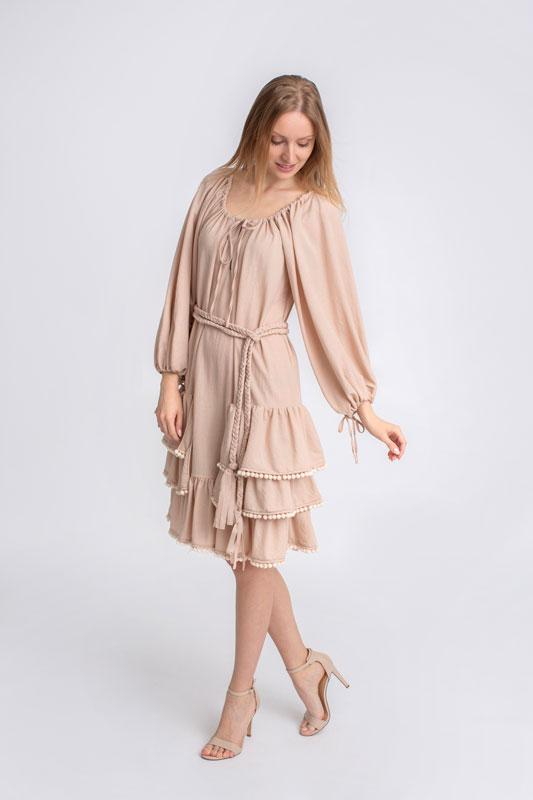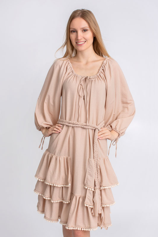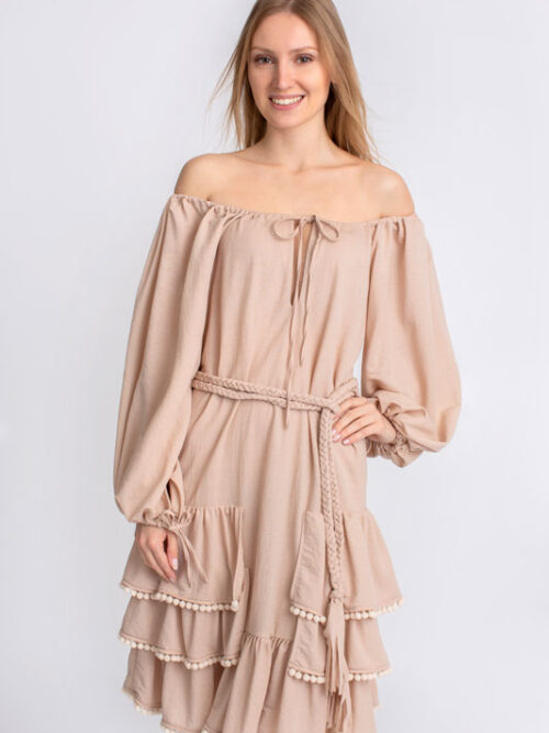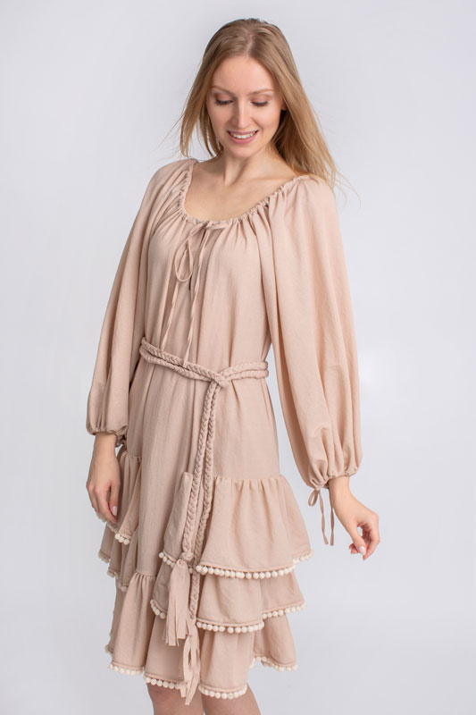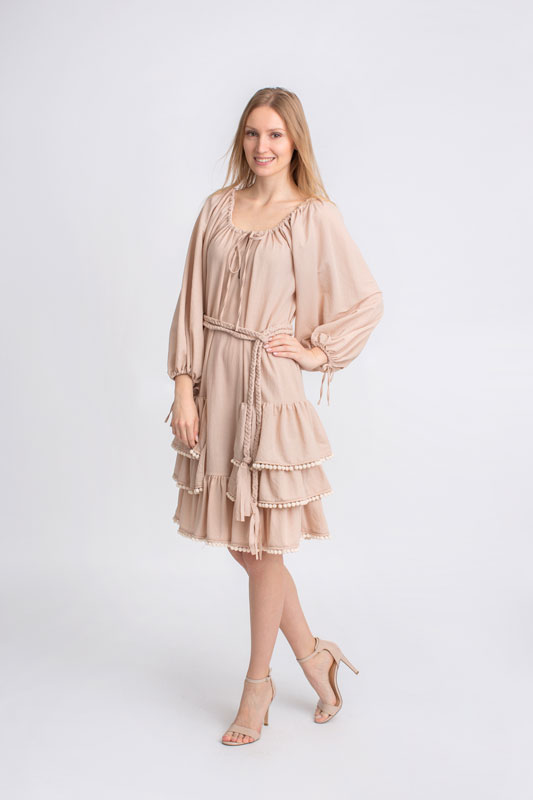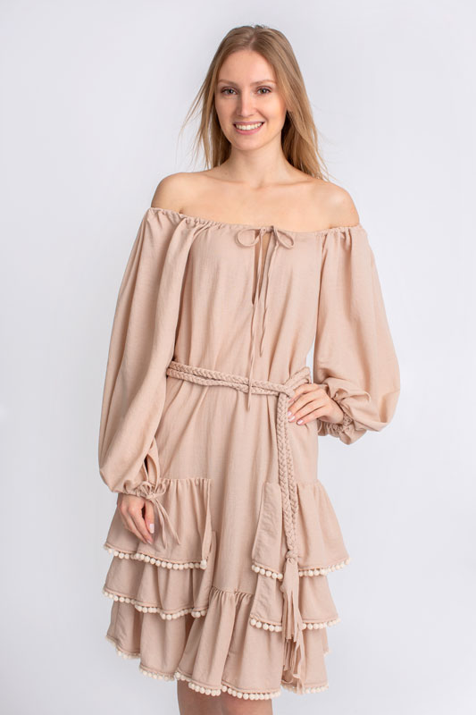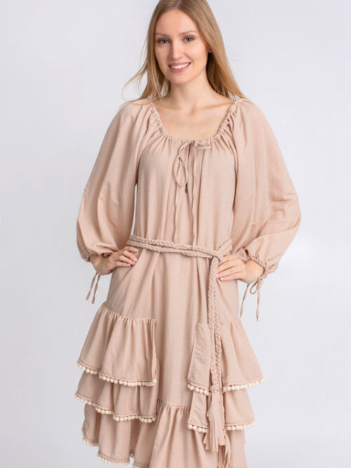 Šaty boho krátke s volánmi BY O LA LA v béžovej farbe.