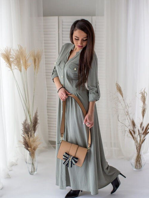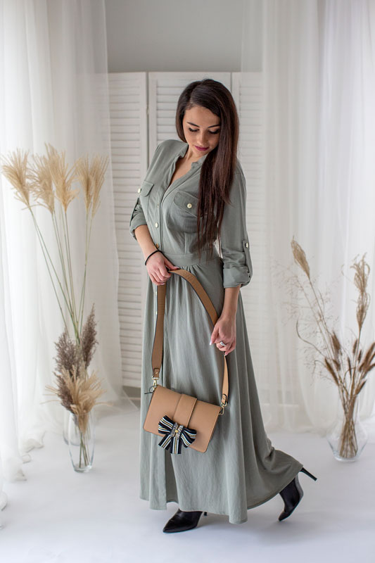 Štýlové dlhé košeľové šaty v sivozelenej farbe. Šaty majú dlhý rukáv a zapínajú sa po celej dĺžke na gombíky. Tento kúsok je vyrobený z kvalitného materiálu.