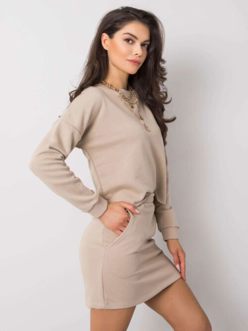 Elegantný teplákový komplet so sukňou v béžovej farbe. Súprava sa skladá z mikiny a sukne. Je vyrobená z príjemného bavlneného materiálu a kvalitne spracovaná. Sukňa má po bokoch vrecká a v páse gumu, čo zaručuje pohodlie pri nosení. Je to veľmi obľúbený kúsok, vhodný na bežné nosenie.