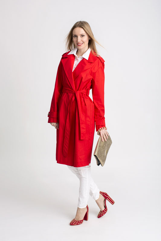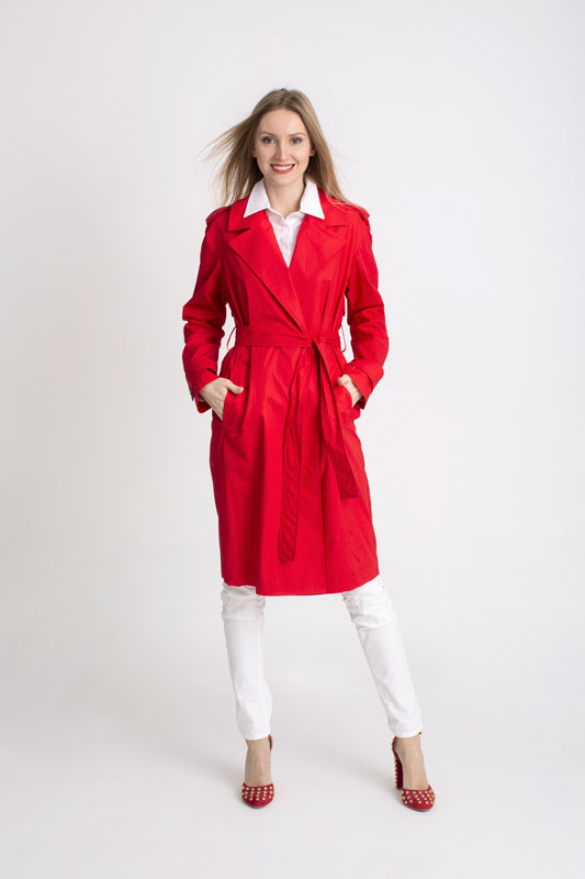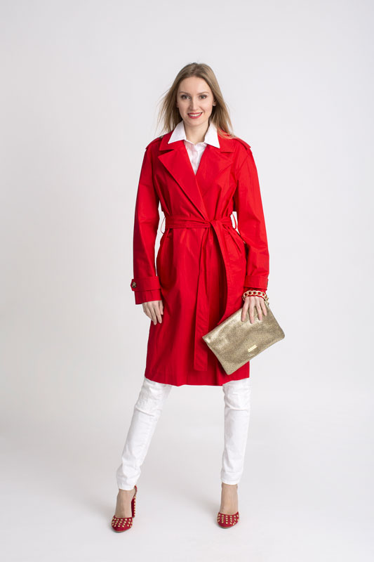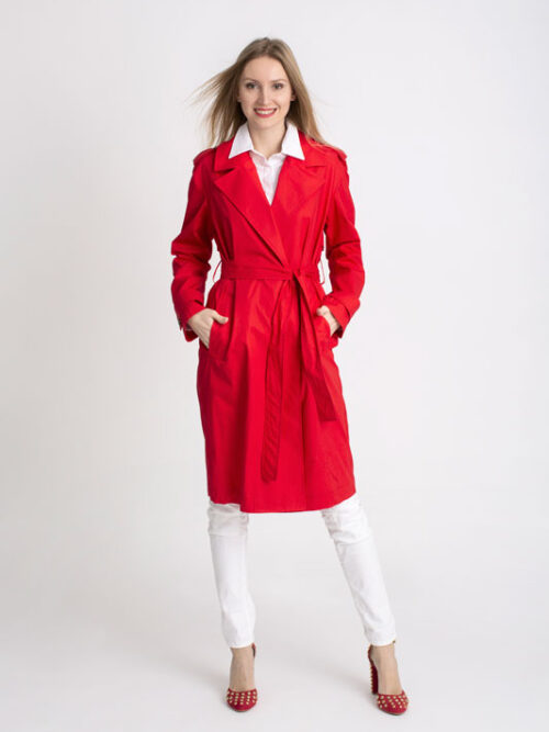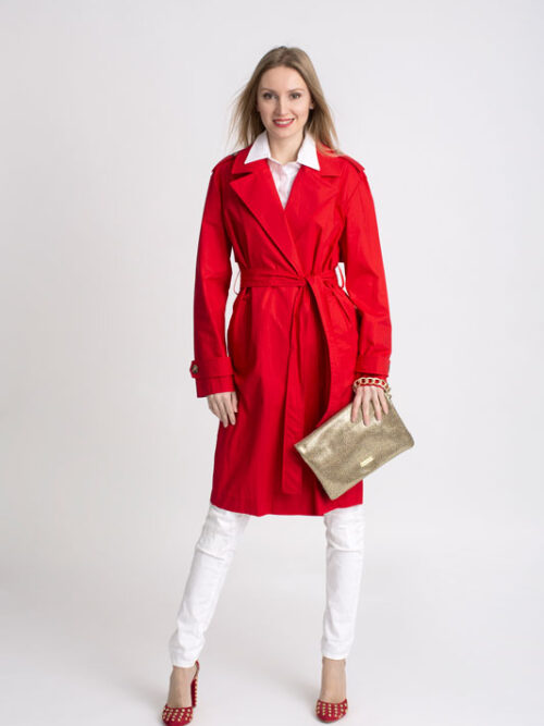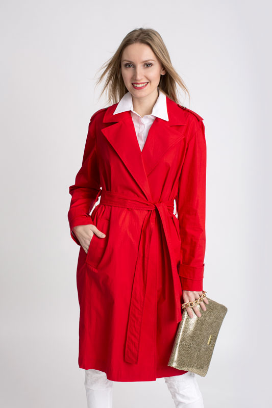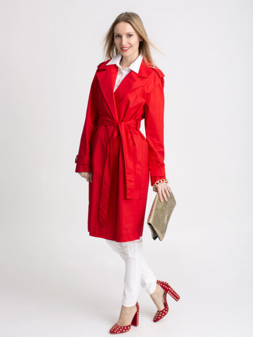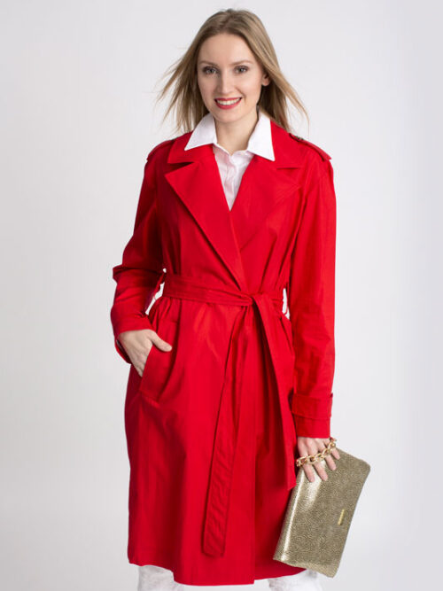 Jarný plášť PLEASE v krásnej pútavej červenej farbe so zapínaním na gombíky, bočnými vreckami a je doplnený opaskom.